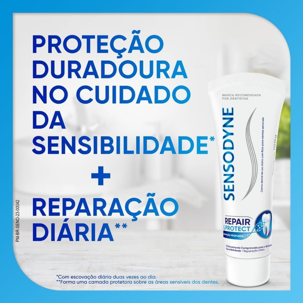 Creme Dental Sensodyne Repair & Protect 100g O Creme Dental Sensodyne Repair & Protect 100g é especialmente formulado para proteger e reparar áreas sensíveis dos dentes, fortalecendo o esmalte e proporcionando cuidado completo para quem sofre com sensibilidade dental. Principais Características: • Tecnologia de reparação avançada – Repara as áreas frágeis do esmalte dentário, fortalecendo a superfície dos dentes. • Proteção contra sensibilidade – Cria uma barreira que reduz a dor causada por estímulos externos como frio, calor e doces. • Limpeza eficaz – Remove placas e impurezas, mantendo a boca limpa e o hálito fresco. Benefícios: - Ajuda a reparar danos no esmalte e previne novas sensibilidade - Proporciona alívio duradouro e proteção contra a sensibilidade dental - Promove higiene bucal completa e hálito refrescante - Recomendado por dentistas para cuidados diários Diferenciais do Produto: - Combinação exclusiva de ingredientes que reparam e protegem simultaneamente - Fórmula suave, adequada para uso diário em dentes sensíveis - Marca líder mundialmente reconhecida em cuidado dental Especificações Técnicas: - Peso: 100g Instruções de Uso: - Escove os dentes pelo menos duas vezes ao dia com a quantidade adequada do produto. Para melhores resultados, utilize regularmente e siga as recomendações do seu dentista. Avisos e Precauções: - Manter fora do alcance de crianças. Não ingerir. Em caso de irritação, suspenda o uso e procure orientação profissional. O que está incluso? - 1 Creme Dental Sensodyne Repair & Protect 100g ---- DÚVIDAS FREQUENTES ---- Os produtos são originais? Sim. Todos os nossos produtos são originais. Emitem nota fiscal? Sim. Emitimos nota fiscal para todos os pedidos.