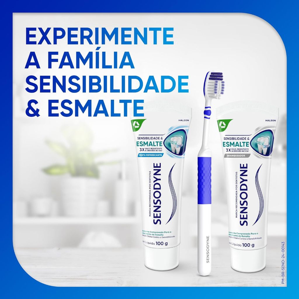 Creme Dental Sensodyne Sensibilidade & Esmalte Branqueador 100g O Creme Dental Sensodyne Sensibilidade & Esmalte Branqueador foi desenvolvido para pessoas que sofrem com dentes sensíveis e desejam um sorriso mais branco sem abrir mão da proteção. Sua fórmula exclusiva ajuda a fortalecer o esmalte, reduzir a sensibilidade e remover manchas superficiais, proporcionando um cuidado completo e seguro para uso diário. Principais Características: Proteção Eficaz Contra a Sensibilidade Dentária Atua diretamente nos canais que levam ao centro do dente, proporcionando alívio contínuo da dor causada por alimentos frios, quentes ou doces. Fortalecimento do Esmalte Dental Com tecnologia que remineraliza e protege o esmalte, ajudando a prevenir o desgaste causado pela escovação e ácidos alimentares. Ação Branqueadora Suave Remove suavemente manchas superficiais, devolvendo o brilho natural dos dentes sem causar abrasão excessiva. Benefícios: Alívio da sensibilidade dentária com uso regular Fortalecimento e proteção do esmalte Clareamento gradual e seguro dos dentes Sensação prolongada de frescor e limpeza Prevenção contra cáries com flúor ativo Pode ser usado como creme dental principal Diferenciais do Produto: Combinação de alívio da sensibilidade, proteção do esmalte e ação branqueadora em um só produto Fórmula de baixa abrasividade, ideal para dentes sensíveis Desenvolvido por especialistas e recomendado por dentistas Seguro para uso diário Embalagem prática e econômica com 100g Especificações Técnicas: Peso: 100g Instruções de Uso: Escove os dentes com o Creme Dental Sensodyne Sensibilidade & Esmalte Branqueador pelo menos duas vezes ao dia ou conforme orientação do seu dentista. Para melhores resultados, use uma escova de cerdas macias e evite enxaguar a boca com muita água após a escovação. Avisos e Precauções: Uso adulto. Não recomendado para crianças menores de 12 anos, exceto sob orientação profissional. Evite engolir. Caso os sintomas persistam, consulte seu dentista. Armazene em local seco, fresco e longe da luz solar direta. Mantenha fora do alcance de crianças. O que está incluso? 1 unidade de Creme Dental Sensodyne Sensibilidade & Esmalte Branqueador 100g ---- DÚVIDAS FREQUENTES ---- Os produtos são originais? Sim. Todos os nossos produtos são originais. Emitem nota fiscal? Sim. Emitimos nota fiscal para todos os pedidos.