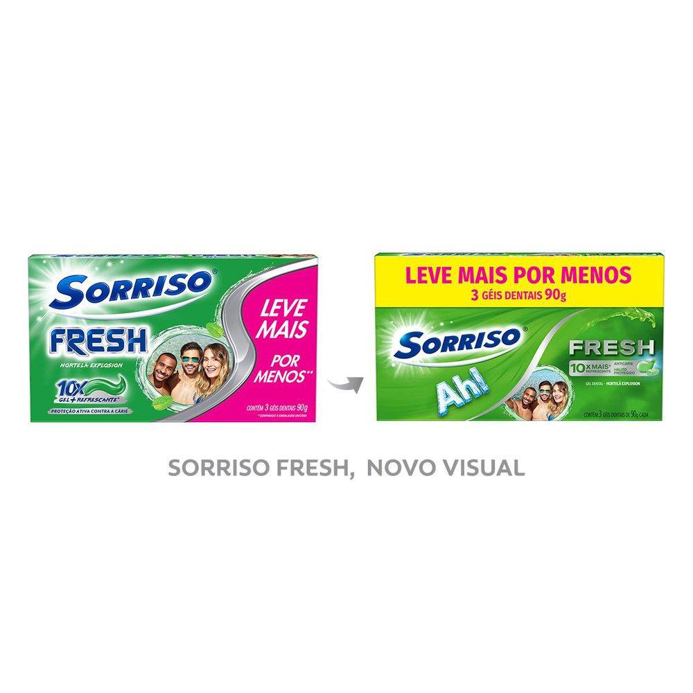 O gel dental Sorriso Fresh é o primeiro gel com fórmula exclusiva que conta com a técnologia FreezeStorm, que garante 10x mais refrescância Benefícios: Proteção ativa contra a cárie Gel 10x mais refrescante O poder do enxaguante agora no Gel Sabores intensos e duradouros Embalagem econômica