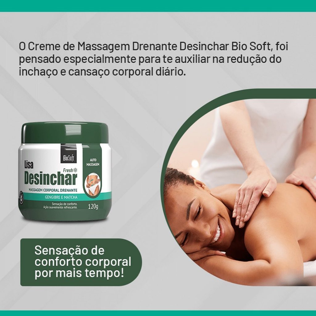 Creme Desinchar Drenante 120g O Creme de Massagem Drenante Desinchar Bio Soft foi desenvolvido especialmente para combater o inchaço e o cansaço corporal do dia a dia. Sua fórmula à base de extratos naturais de Gengibre e Matcha atua em sinergia com a automassagem e a prática de atividades físicas, estimulando a drenagem de líquidos retidos, melhorando a microcirculação e o metabolismo celular. Resultados comprovados: • 81% relataram alívio do cansaço físico e redução do inchaço provocado pelo acúmulo de líquidos. • Sensação imediata de conforto • Suave ação refrescante Validade: 36 meses a partir da data de fabricação indicada na embalagem. Indicação de uso: Para homens e mulheres que sofrem de inchaço corporal causado pela retenção de líquidos. Cansaço e fadiga associados a má circulação corporal. Pode ser usado nas regiões dos pés, pernas, abdômem e ombros onde normalmente são áreas mais afetadas pelo inchaço. Modo de uso: Com a pele limpa e seca, aplique o produto diariamente em todo o corpo, principalmente nas regiões afetadas pela retenção hídrica, massageando suavemente por um minuto. Atenção: As listas de ingredientes dos produtos são regularmente atualizadas. Por isso, incentivamos você a verificar os ingredientes na embalagem do seu produto para assegurar que os componentes são adequados ao seu uso pessoal. Ingredientes: Aqua(Água), Cetearyl Alcohol(Álcool Cetoestearílico), Camellia Sinensis Leaf Extract(Extrato Da Folha De Camellia Sinensis), Cetyl Alcohol(Álcool Cetílico), Stearic Acid(Ácido Esteárico), BHT(Butil-Hidroxitolueno), Zingiber Officinale Root Extract(Extrato Da Raiz De Zingiber Officinale),Alcohol( Álcool Etílico), EDTA(Ácido Edético),Tetrasodium EDTA (Edetato De Sódio), Allantoin(Alantoína), Phenoxyethanol( Fenoxietanol), Methylparaben(Metilparabeno), Propylparaben(Propilparabeno),Ethylparaben(Etilparabeno), Butylparaben(Butilparabeno), Aminomethyl Propanol(Aminometilpropanol), Glyceryl Stearate( Monoestearato De Glicerila), Cyclopentasiloxane(Decametilciclopentasiloxano), Dimethicone(Dimeticona), Menthol(Mentol),Propylene Glycol(Propilenoglicol),Glycerin(Glicerol), Prunus Amygdalus Dulcis Oil( Óleo De Amêndoas),Paraffinum Liquidum(Petrolato Líquido)