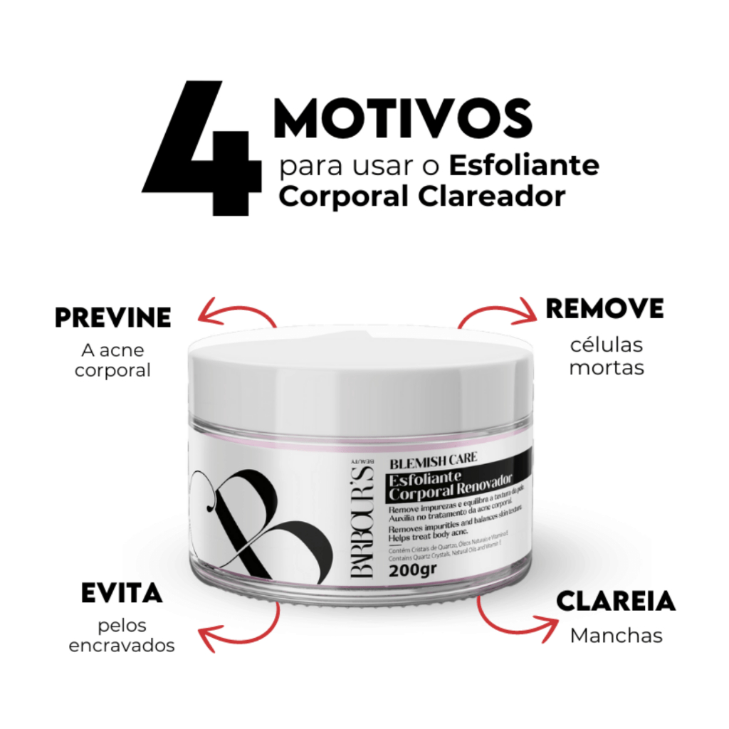 CREME ESFOLIANTE CORPORAL BLEMISH CARE BARBOUR'S BEAUTY 200G REMOVE IMPUREZAS EVITA PELOS ENCRAVADOS SOBRE O PRODUTO: Esfoliante corporal enriquecido com uma combinação poderosa de ingredientes naturais, em uma fórmula inovadora que proporciona uma experiência de esfoliação revitalizante. INDICAÇÃO: Indicado para peles com manchas e com acnes corporal A CIÊNCIA POR TRÁS DA BELEZA: Sua fórmula Hipoalergênica rica em cristais de quartzo e sementes de damasco, proporciona uma pele uniforme e macia, auxiliando na remoção de células mortas e reduzindo pelos encravados, além de proporcionar bem estar após a depilação. BENEFÍCIOS: Pele uniforme e macia, auxiliando na remoção de células mortas e reduzindo pelos encravados. MODO DE USO: Aplique sobre a pele úmida, massageando suavemente em movimentos circulares. Concentre-se nas áreas ásperas ou áreas escuras. Enxágue abundantemente. Use 2 vezes por semana para uma renovação contínua. RESULTADOS: CREME ESFOLIANTE CORPORAL BLEMISH CARE BARBOUR'S BEAUTY 200G REMOVE IMPUREZAS EVITA PELOS ENCRAVADOS -Remove impurezas e equilibra a textura da pele. -Auxilia no tratamento da acne corporal. NOTAS DA FRAGRÂNCIA: Acído Silicílico, Niacinamida, Extrato de Aloe Vera, Alfa-bisabolol COMPOSIÇÃO: Aqua (água); silica (dióxido de silício); cetearyl alcohol (álcool cetoestearílico); glycerin (glicerol); prunus amygdalus dulcis oil (óleo de amêndoas); propylene glycol (propilenoglicol); ceteareth-20 (cetomacrogol 1000); glyceryl stearate (monoestearato de glicerila); stearic acid (ácido esteárico); parfum (perfume); sorbitan olivate (miristato de sorbitan); butyrospermum parkii butter (manteiga de karité); isopropyl myristate (miristato de isopropila); propanediol (propanodiol); benzoic acid (ácido benzóico); pixa nitida seed oil (óleo da semente de urucum); disodium edta (edetato dissódico); vitis vinifera seed oil (óleo da semente de uva); polyglyceryl-3 ricinoleate (ricinoleato de poliglicerila-3); polyglyceryl-3 oleate (oleato de poliglicerila-3); curcuma longa root extract (extrato da raiz de cúrcuma); pht (butil-hidroxitolueno); tocopheryl acetate (acetato de tocoferila); prunus armeniaca seed powder (semente de damasco em pó); glyceryl rosinate (ésteres glicerílicos de resina hidrogenados); candelilla cera (cera de candelila); tocopherol (tocoferol); phytosterols (fitosteróis); benzotriazolyl dodecyl p-cresol (benzotriazolil dodecil p-cresol); sodium hydroxide (hidróxido de sódio); lactic acid (ácido láctico); benzyl alcohol (álcool benzílico); hexyl cinnamal (hexil cinamal); limonene (limoneno); linalool (linalol). Nota de Esclarecimento sobre Referências Olfativas - Barbour's Beauty Na Barbour's Beauty, desenvolvemos produtos com inspirações olfativas únicas, criados para proporcionar experiências sensoriais distintas e enriquecedoras aos nossos clientes. É importante ressaltar que qualquer menção a outras marcas ou produtos em nossas comunicações visa exclusivamente oferecer uma referência olfativa que facilite a identificação das características aromáticas de nossos produtos. Esclarecimentos Importantes: Independência da Marca: A Barbour's Beauty não possui vínculos com quaisquer outras marcas ou produtos mencionados. As referências são utilizadas estritamente para fins de contextualização olfativa. Propriedade das Marcas: Todas as marcas ou produtos mencionados pertencem a seus respectivos fabricantes e desenvolvedores. Uso de Referências: O uso de descrições olfativas similares é uma ferramenta para enriquecer a experiência do consumidor, oferecendo uma noção preliminar dos aromas, sem sugerir similitude completa com produtos de outras marcas. Inspiração Criativa: A menção de ""inspiração olfativa"" não constitui promessa de resultados idênticos ou similares aos de outros produtos no mercado. Cada composição olfativa da Barbour's Beauty é uma criação exclusiva, com direção artística própria. Compromisso com a Qualidade e Transparência: Na Barbour's Beauty, estamos comprometidos em oferecer produtos de alta qualidade, com fragrâncias exclusivas que verdadeiramente capturam a essência de nossa marca. Nosso objetivo é sempre assegurar transparência e clareza para nossos clientes, garantindo uma experiência de compra autêntica e satisfatória.