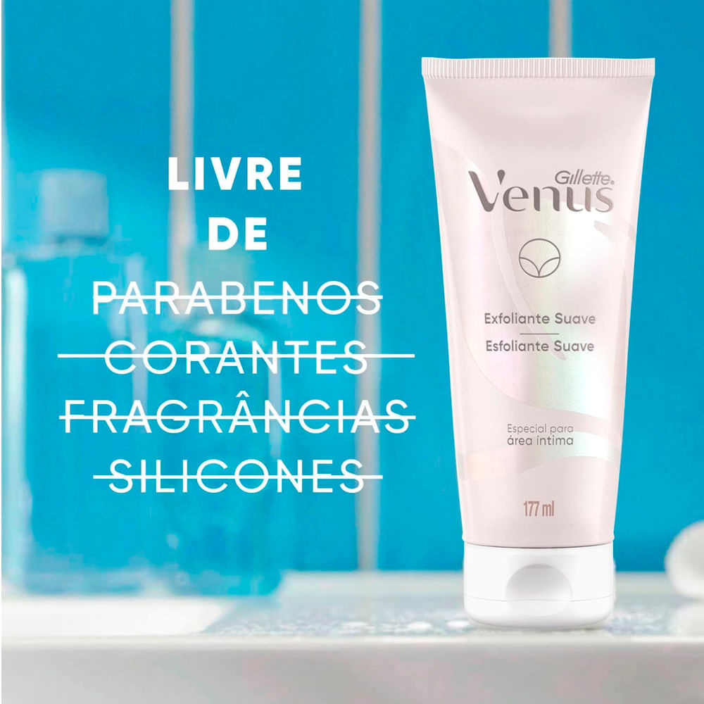 O Creme Esfoliante Gillette Venus Suave 177ml foi desenvolvido para pré-depilação ou nos dias em que você não se depila, esfoliando e uniformizando a pele. Suas partículas finas uniformizantes esfoliam gentilmente a superfícies da pele para ajudar a eliminar células mortas e sebo, que podem causar os pelos encravados. Sua fórmula possui pH balanceado, está livre de fragrâncias, corantes, parabenos e silicones e está dermatologicamente e ginecologicamente testada. Benefícios: - Esfolia e uniformiza a pele; - Partículas finas, exfoliação gentil; - Ajuda a remover células mortas e sebo; - Dermatologica e ginecologicamente testado; - pH balanceado; - Livre de parabenos, corantes, fragrâncias e silicones. Modo de usar: Esfregue gentilmente uma pequena quantidade na pele molhada da região genital externa até formar uma espuma leve. Enxágue com bastante água. Sobre a marca: Há quase duas décadas, Venus transformou uma categoria que era dura e masculina com a criação de uma experiência verdadeiramente feminina de depilar. Acreditamos que toda mulher merece se sentir confortável em sua pele.