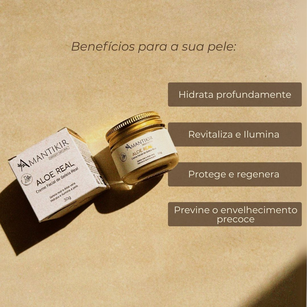 Creme Facial Natural Aloe Real 30g Amantikir Hidratante, Nutritivo e Rejuvenescedor Produto certificado pelo IBD com 100% de Ingredientes Naturais e 60% de Ingredientes Orgânicos Desperte a beleza da sua pele com nosso Creme Facial Natural inspirado nos alimentos consumidos pela realeza das abelhas, a geleia real. Uma experiência sensorial que convida você a descobrir o poder da natureza em cada aplicação. Com uma sinergia de ingredientes botânicos para a pele, combina o extrato de Geleia Real com os extratos de Mel e de Aloe Vera, a manteiga de Karité e os óleos de Pracaxi e Rosa Mosqueta, que auxiliam a restaurar a barreira cutânea, combatendo o envelhecimento precoce e conferem hidratação, vitalidade, além de iluminar a pele. Hidrata, ilumina e restaura a barreira protetora da pele. Indicado para todos os tipos de pele, especialmente secas e mistas. Principais ativos: Geleia real – Aloe vera – Mel – Buriti – Pimenta rosa – Rosa mosqueta – Ácido hialurônico – Camomila – Calêndula – Lavanda francesa Na natureza as abelhas trabalham diligentemente para criar algo extraordinário que alimenta sua rainha: a Geleia Real. Este ingrediente poderoso, repleto de vitaminas, aminoácidos e lipídios, é a peça central da nossa fórmula, dedicada a revitalizar e iluminar sua pele. A Aloe vera possui ação hidratante, calmante que suaviza a pele e traz refrescância. O extrato de Mel possui propriedades suavizantes, auxiliando na proteção e na redução de marcas na pele. O óleo de Buriti traz propriedades emolientes e antioxidantes, ajudando no combate ao envelhecimento precoce da pele. A manteiga de Karité, rica em ácidos graxos, vitamina A e E, é um potente regenerador cutâneo que hidrata profundamente a pele, protegendo de agressões externas. O óleo de Pracaxi, rico em ácido behênico, é um ácido graxo que cria uma barreira protetora contra a poluição e os riscos ambientais. O óleo de Rosa mosqueta possui propriedades que auxiliam na regeneração da pele, reduz linhas de expressão e possui na sua composição o ácido trans-retinóico que suaviza manchas leves. O ácido hialurônico é uma substância que está presente naturalmente na pele e auxilia a manter a sua sustentação e hidratação, retardando o surgimento de linhas de expressão. A Camomila e a Calêndula têm substâncias calmantes que hidratam, proporcionam mais vitalidade e iluminam a pele. O óleo essencial de Pimenta Rosa conta com propriedades antioxidantes e adstringentes, o que pode ajudar a tonificar a pele e reduzir a aparência de poros dilatados. O óleo essencial de Lavanda ajuda a acalmar e possui antioxidantes que previnem o envelhecimento precoce. Tenha confiança na qualidade do que você está aplicando em sua pele. Nosso produto é certificado pelo IBD, garantindo que cada ingrediente seja natural e escolhido com o maior cuidado. Sinta a diferença de uma pele verdadeiramente nutrida e revitalizada com produtos Amantikir. Livre de: Petrolatos, Parabenos, Transgênicos, Silicones, Fragrâncias sintéticas, Óleo mineral. Modo de usar: Com a pele limpa, aplique uma pequena quantidade do Creme Facial Aloe Real no rosto e pescoço espalhando suavemente. Precauções: Uso externo. Mantenha fora do alcance de crianças. Suspenda o uso em caso de sensibilidade. Evite contato com olhos e mucosa, se isso ocorrer, lave com água em abundância. Conservar em local fresco, seco e ao abrigo da luz.