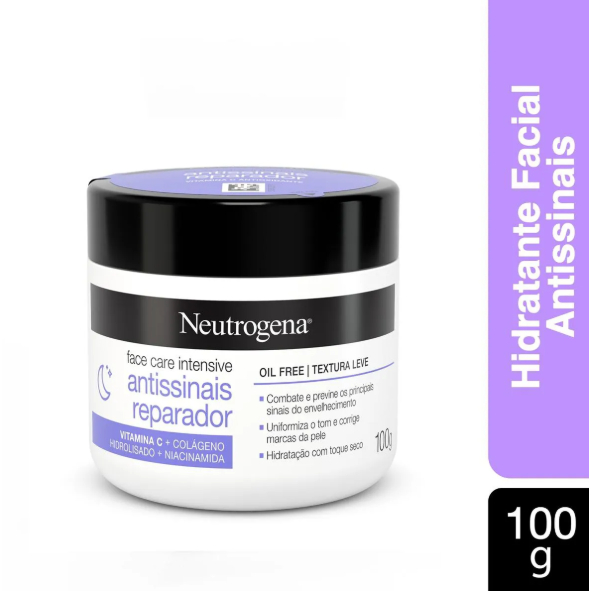 O Creme Facial Neutrogena Face Care Antissinais Reparador hidrata profundamente e combate os sinais de envelhecimento. Com textura leve, é ideal para uso diário, reduzindo linhas finas e deixando a pele mais firme, suave e radiante. Dermatologicamente testado.
