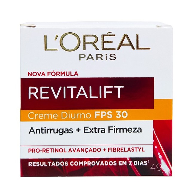 Creme de Tratamento Antirrugas + Firmeza Revitalift Diurno FPS30 49g Loreal 1 Unidade Creme de tratamento anti-idade diurno intenso para todos os tipos de pele. L'Oréal Paris Dermo-Expertise Revitalift Creme Diurno FPS 30 age em duas frentes: suavizando rugas e combatendo a flacidez. Assim, o resultado é um rosto rejuvenescido e revitalizado! Com uma textura leve, L'Oréal Paris Dermo-Expertise Revitalift Creme Diurno FPS 30 deixa uma sensação confortável na pele. Sua fórmula é poderosa e estimula a renovação celular e ainda protege as fibras de sustentação do rosto, aumentando a firmeza. Com proteção solar, também mantém a pele a salvo das radiações UV. Assim, você se mantém sempre com uma aparência jovem e imune ao tempo. Ação: Pro-Retinol A: ativo antirrugas que estimula a renovação celular. Fibre Elastyl: tecnologia desenvolvida pelos laboratórios L'Oréal Paris, protege, aumenta e fortalece as fibras de elastina para que seu rosto não sofra com a flacidez. Modo de uso: Aplique o creme por todos rosto e pescoço, diariamente e pela manhã.