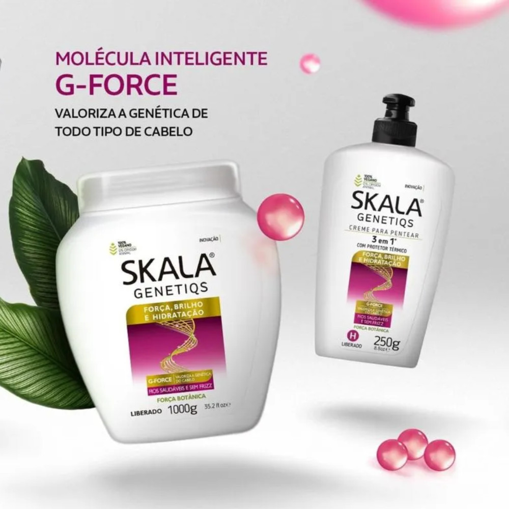 Creme de Tratamento Capilar Skala Genetiqs 1kg O Creme de Tratamento Capilar Skala Genetiqs 1kg oferece uma revitalização completa aos fios, combatendo os danos causados por fatores externos como produtos químicos, poluição e danos físicos. Livre de sulfato, parabenos, petrolato, silicones e óleo mineral, ele proporciona força, brilho e hidratação para todos os tipos de cabelo. Benefícios e Diferenciais:Força Botânica: Tecnologia G-Force que restaura e valoriza as características genéticas de cada tipo de cabelo.Repara a fibra capilar: Ajuda a estimular o crescimento saudável dos fios e aumenta a resistência capilar.Tratamento completo: Indicado para cabelos secos, fracos, cacheados, crespos, quimicamente tratados e danificados.Ideal para:- Cabelos lisos, cacheados ou crespos.- Cabelos secos, armados, fracos, quebradiços, opacos ou danificados.- Cabelos quimicamente tratados, mistos ou oleosos.- Etapa do Cronograma Capilar:- Hidratação Modo de Uso:Aplique o creme nos cabelos limpos, massageando mecha por mecha.Deixe agir por 3 minutos e enxágue. Para um resultado mais intenso, utilize touca térmica por 15 minutos.Como Pré-Shampoo: Aplique nos fios secos, enluvando mecha por mecha.Deixe agir e enxágue, depois lave com shampoo e condicionador da linha Skala Genetiqs.Como Co-Wash: Aplique uma pequena quantidade nos cabelos molhados, massageie o couro cabeludo como um shampoo.Enxágue, depois aplique no comprimento e pontas para desembaraçar.Repita o processo caso necessário.Precauções:Evite o contato com os olhos e mucosas. Em caso de contato, enxágue abundantemente com água.Mantenha fora do alcance das crianças e em local seco, longe de luz solar e calor intenso.