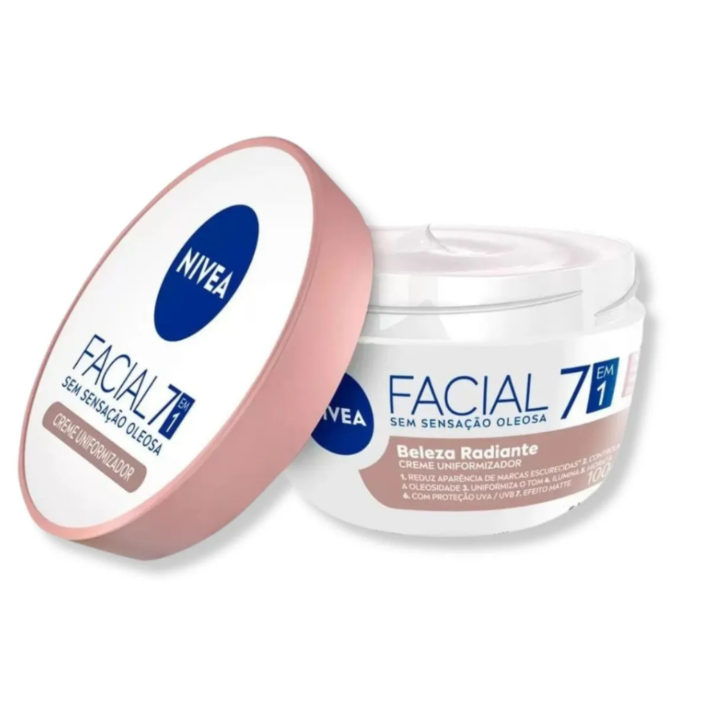 Controla a oleosidade e promove efeito matte. Uniformiza o tom de pele, ilumina e hidrata. Oferece proteção UVA e UVB. Reduz marcas escurecidas. Indicado para pele negra e pele oleosa. O que é? NIVEA Hidratante Facial 7 em 1 Beleza Radiante é um creme hidratante desenvolvido especialmente para atender às necessidades da pele negra. Para que serve? Sua fórmula única contém ingredientes como Ácido Hialurônico, Extrato de Pérolas e Cúrcuma, que proporcionam benefícios incríveis para a pele. Este hidratante oferece 7 benefícios em 1 só produto: reduz a aparência de marcas escurecidas, controla a oleosidade, uniformiza o tom de pele, ilumina, hidrata, possui proteção UVA/UVB e proporciona um efeito matte. AVISO: Precauções: Uso externo. Evite contato com os olhos. Caso aconteça, enxágue com água em abundância. Em caso de irritação, suspenda o uso e procure orientação médica. Manter em local seco e arejado, ao abrigo de luz e fora do alcance de crianças. Este produto não é um protetor solar.