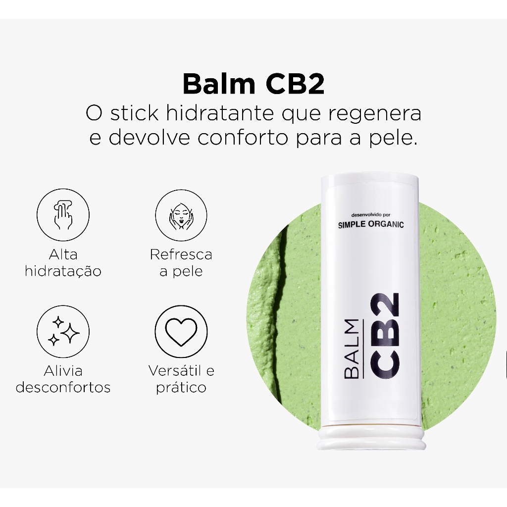 A Simple Organic é referência em clean beauty no Brasil, com produtos de high performance, ativos premium e tecnologia inovadora. Suas fórmulas são veganas, cruelty-free, sustentáveis e clinicamente testadas, garantindo resultados reais e seguros. Com eficácia comprovada por testes clínicos e recomendada por dermatologistas, a Simple Organic entrega muito mais do que beleza: oferece tratamentos eficazes, inovadores e responsáveis que cuidam da sua pele e do planeta. Sobre o produto: Balm CB2 O CB.2 Simple Organic é um produto que hidrata, perfeito para quem precisa de uma regeneração poderosa e eficaz. Um hidratante facial em stick, formulado com um blend de ativos naturais da Amazônia, que serve para acalmar a pele, promover conforto e refrescância. Prático e inovador, pode ser usado diariamente ou de forma pontual, sempre que sentir necessidade de aliviar desconfortos na pele. Dermatologicamente testado, o Balm CB.2 une o poder da natureza à alta performance para regenerar e melhorar a textura da pele. É um hidratante para o rosto, com fórmula limpa e livre de ingredientes sintéticos ou de origem animal, como Ceras Sintéticas, Cera de Abelha, Silicones e Conservantes Sintéticos. Como alternativa, promovemos impacto positivo e consciência ecológica através da utilização de matérias-primas de origem natural e certificada, como o Complexo de Ceras Vegetais, agente de consistência natural, Glicerina vegana e Vitamina E. Além do poderoso blend de óleos da Amazônia, trouxemos Fitoesqualane, um Squalane Natural de origem vegetal, na versão aprovada Cosmos. O Balm CB.2 possui alta espalhabilidade, é fácil de aplicar e pode ser inserido na sua rotina de skincare facial com a pele higienizada após as nossas Soluções e Séruns, ou em demais regiões corporais onde sentir necessidade de aliviar desconfortos cutâneos. É a escolha de Clean Beauty perfeita para todos os tipos de pele, ideal para uso diário, com fórmula limpa, vegana e livre de ingredientes sintéticos. Volume: 12 g. Como usar: Aplique diretamente sobre o rosto, massageie e deixe a pele absorver o produto. Onde usar: No rosto ou em regiões que necessitem de alívio. Quando usar: Uso diurno e noturno. Tipo de pele: Variados tipos de peles. Acabamento: Pele hidratada e macia. Textura: Balm, refrescante e delicada. Precauções: Uso externo. Manter longe do alcance de crianças. Evitar contato com os olhos. Armazenar em local seco, arejado, ao abrigo da luz e outras fontes de calor. Em caso de irritação, suspenda o uso e, se os sinais persistirem, procure um médico. Utilize protetor solar. Quais são os ingredientes? Ativos: Blend de Óleos Amazônicos, Esqualano, Óleo Essencial de Menta Piperita. Composição: Aqua, Coco-Caprylate/Caprate, Helianthus Annuus Seed Cera, Copaifera Officinalis Resin, Oryza Sativa Cera, Polyglyceryl-6 Polyhydroxystearate, C10-18 Triglycerides, Silica, Sodium Chloride, Glycerin, Polyglyceryl-6 Polyricinoleate, Jojoba Esters, Glyceryl Caprylate, Esqualano, Óleo de Semente de Passiflora Edulis, Tocoferol, Óleo de Mentha Piperita, CI 77288, Acacia Decurrens Flower Cera, Poliglicerina-3, Palmitato de Ascorbilo, Limoneno, Eugenol, Geraniol. Composição (português): Água, Coco-Caprilato/Caprato, Cera da Semente de Helianthus Annuus, Resina de Copaifera Officinalis, Cera de Oryza Sativa, Poli-Hidroxiestearato de Poliglicerila-6, Triglicerídeos C10-18, Dióxido de Silício, Cloreto de Sódio, Glicerol, Poliricinoleato de Poliglicerila-6, Ésteres da Jojoba, Caprilato de Glicerila, Esqualano, Óleo da Semente de Passiflora Edulis, Tocoferol, Óleo de Menta Piperita, Corante Verde 77288, Cera da Flor De Acacia Decurrens, Poliglicerina-3, Palmitato de Ascorbila, Limoneno, Eugenol, Geraniol.