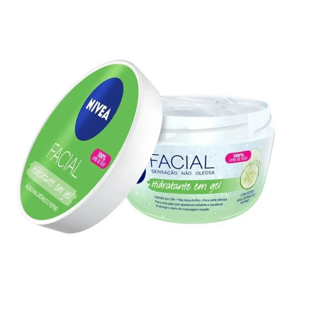 Hidratante em gel NIVEA com ácido hialurônico e pepino. Textura mais leve que o creme facial. Não obstrui os poros e hidrata por 24h. Cuide bem da sua pele! Com ácido hialurônico e pepino, o novo NIVEA Facial Hidratante em Gel é 100% livre de óleos, ideal para pele oleosa. 100x mais leve que um creme facial normal, ele prolonga o efeito da maquiagem na pele, não obstrui os poros e hidrata por 24h sem deixar brilho. Para uma pele com aparência radiante e saudável. Hidratação intensa; Sensação não oleosa; 100% livre de óleo; Com ácido hialurônico e pepino; Não deixa brilho.