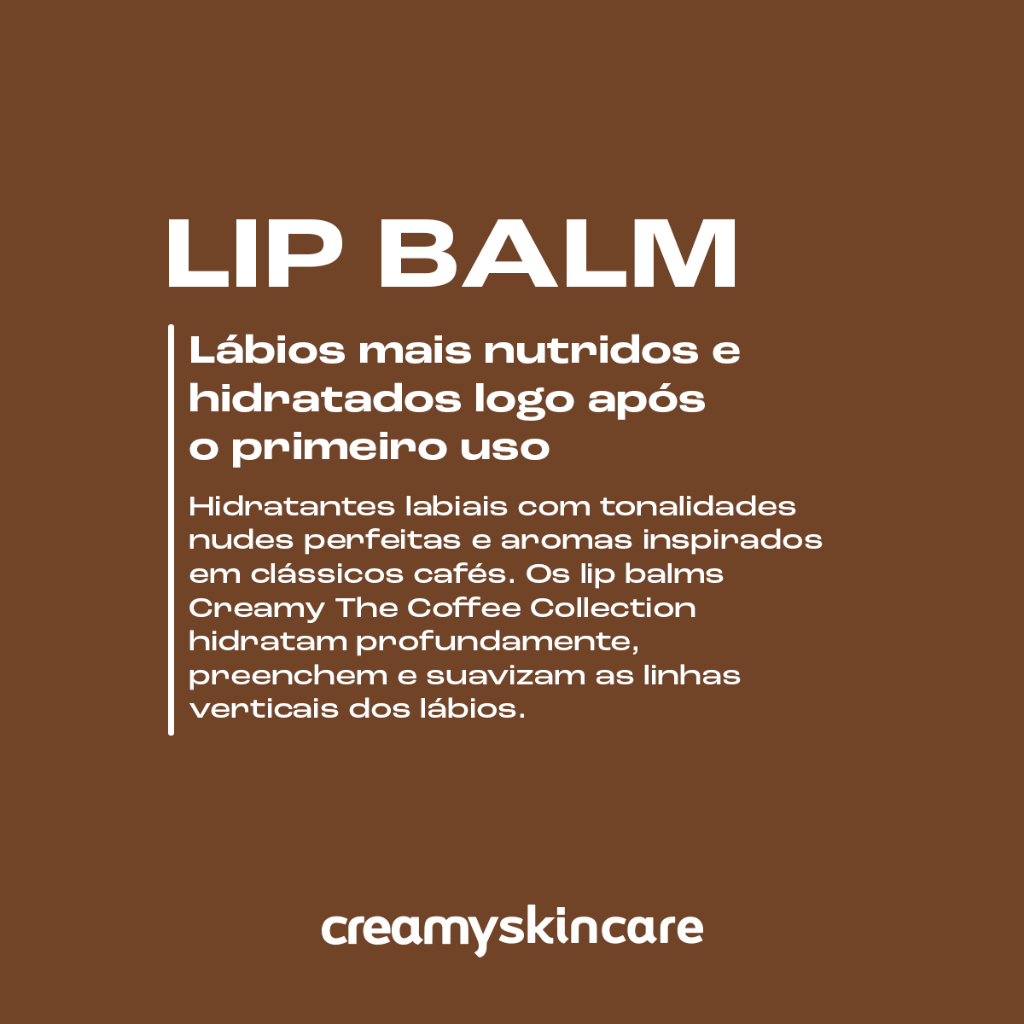 O que é?Conheça os Lip Balms The Coffee Collection, uma collab Creamy + The Coffee. Apresentamos três versões irresistíveis: Mocha, Latte e Chai. Cada uma trazendo tonalidades nudes perfeitas e aromas únicos inspirados nesses clássicos cafés. Formulados para nutrir intensamente, esses hidratantes labiais combatem ressecamento e suavizam as temidas linhas verticais através da tecnologia de peptídeos e ativos exclusivos. Vale destacar o Linefill™ que garante lábios irresistivelmente macios e bem cuidados. Com um brilho delicado, promovem lábios mais volumosos, alcançados através de hidratação imediata e prolongada, e efeito volumizador por estímulo de colágeno, ácido hialurônico com efeito preenchedor de linhas finas. O que você pode esperar desse produto:Efeito pump volumizador dos lábios, sem irritar;Alto poder de hidratação;Preenche as linhas verticais, conhecidas como “código de barras”;Fórmula leve e confortável;Hidrata sem deixar o aspecto pegajoso.
