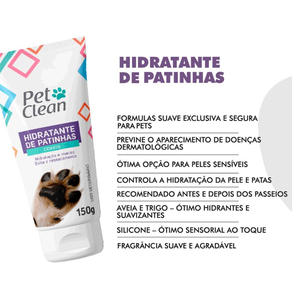 A MANADA ANIMAL é um marketplace de produtos veterinários. É a escolha certa para tutores que prezam pela qualidade dos produtos que seu animal necessita. Tudo com o suporte de uma equipe de veterinários e gestores com mais de 10 anos de experiência no mercado. Fique tranquilo, todos os nossos produtos são originais, adquiridos através de distribuidores credenciados! Ah, e todas as vendas acompanham nota fiscal! MANADA ANIMAL, Tranquilidade pra você, cuidado para ele! _______________________________________ Descrição: Creme Hidratante para Patas Pet Clean O Creme Hidratante para Patas Pet Clean é a solução ideal para manter as patinhas do seu cão sempre saudáveis e protegidas. Com uma fórmula suave e exclusiva, enriquecida com aveia e trigo, oferece uma hidratação profunda e propriedades suavizantes, proporcionando conforto e maciez aos coxins. Seguro para cães de todas as idades, incluindo filhotes a partir de 3 meses, o Hidratante de Patinhas Pet Clean previne o ressecamento e ajuda a evitar o surgimento de doenças dermatológicas, sendo uma excelente opção para cães com pele sensível. Recomendado para uso antes e depois dos passeios, o Hidratante para Patas Pet Clean forma uma camada protetora que controla a hidratação e oferece uma sensação agradável ao toque graças à presença de silicone em sua composição. Além disso, sua fragrância suave e delicada torna o momento de aplicação ainda mais agradável para você e seu pet. Proporcione o cuidado que seu cão merece com o Creme Hidratante Pet Clean, a escolha perfeita para manter as patinhas sempre macias, saudáveis e protegidas. – Indicado para cães; – Evita rachadura nos coxins dos pets; – Proporciona hidratação e maciez. Detalhes: O Creme Hidratante de Patinhas Pet Clean foi desenvolvido especialmente para cães com o intuito de hidratar as delicadas patinhas dos cães. Formulado com matérias primas selecionadas e especiais para cães, este produto permite uma maciez fantástica nos coxins dos pets de todas as idades, inclusive filhotes acima de 3 meses. Conteúdo: 150g Tipo de pet: Cães