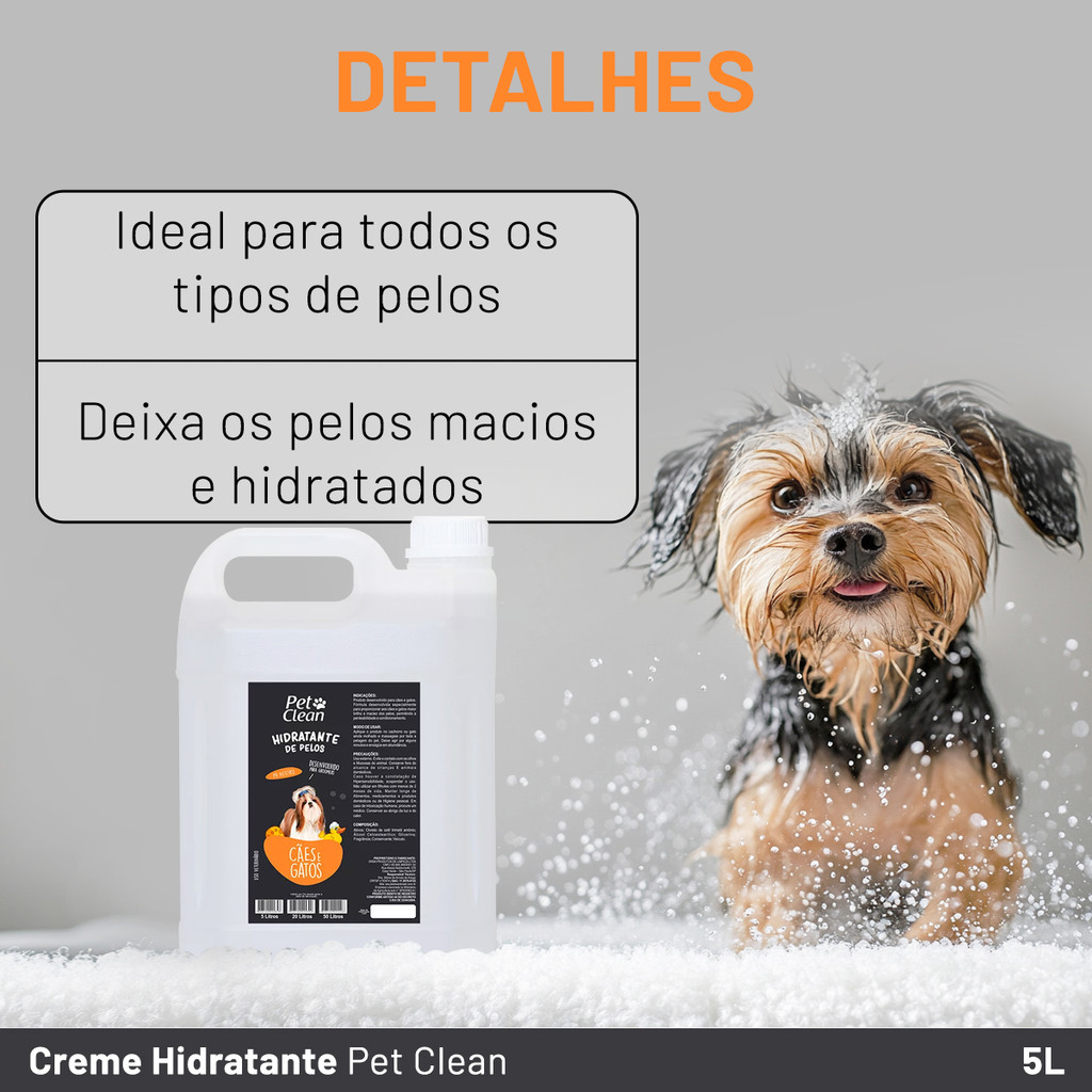 A nossa loja está a mais de 10 anos no mercado, com produtos originais e com nota fiscal. ________________________________________________________________ CONDICIONADOR PET CLEAN PARA CÃES E GATOS 5L - Indicado para cães e gatos - Proporciona brilho intenso e maciez aos pelos - Promove condicionamento e facilita a escovação - Fórmula hidratante para um toque suave e sedoso DESCRIÇÃO O Condicionador Pet Clean para Cães e Gatos 5L foi desenvolvido para oferecer um cuidado completo e eficiente para os pelos do seu pet. Sua fórmula balanceada e especialmente elaborada promove hidratação profunda, deixando os pelos mais macios, brilhantes e fáceis de pentear. Com ingredientes que ajudam a manter a saúde da pelagem, o condicionador melhora a textura dos fios, reduz o frizz e facilita o desembaraço, proporcionando uma aparência mais bonita e saudável. Além disso, sua ação condicionante contribui para uma escovação mais fácil e confortável, evitando quebras e nós. Indicado para cães e gatos de todas as raças e idades, o Condicionador Pet Clean também ajuda a manter a hidratação natural da pele, prevenindo o ressecamento e garantindo um pelo sempre sedoso e bem cuidado. O frasco de 5 litros é ideal para quem busca um produto de alto rendimento, sendo perfeito para uso profissional em pet shops, clínicas veterinárias e centros de estética animal, além de atender tutores que desejam um cuidado premium para seus pets. INDICAÇÃO: Cães e gatos CONTEÚDO: 5L MODO DE USO: Após o banho, aplique o condicionador nos pelos molhados, massageando suavemente. Deixe agir por alguns instantes e enxágue completamente. Para melhores resultados, utilize em conjunto com o shampoo da linha Pet Clean. ________________________________________________________________ Gostou? Não perca tempo, garanta já o seu!