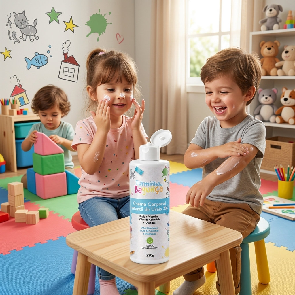 Creme de Ureia 3 % Turminha da Bagunça Infantil - 230 gramas Creme Corporal Infantil de Ureia 3% Ureia + Vitamina E Óleo de Calêndula Amêndoas Ultra Hidratação Livre de corantes e Parabenos Testado Dermatologicamente Produto desenvolvido para auxiliar na manutenção da barreira natural da pele da criança. Formulação delicada e não oleosa hidrata a pele deixando um toque de maciez. Sua formula possui óleo de calêndula, amêndoas e glicerina que promovem hidratação intensa à pele Modo de usar: Aplicar no local desejado massageando até total absorção Composição: Água, Álcool Cetoestearilicom glicerol, manoestearato de glicerina, alcool cetilico, cetomacrogol 1000, ureia, carbomero,triglicerides de acido capricho/ caprilico, edetato, dissodico, butilhidroxi-tolueno, petrolato liquido, oleo de amendoas, alantoina, acetona de tocoferila. Validade: todos os nossos produtos possuem validade de três anos, são produzidos e vendidos dentro de seis meses, ou seja, você desfruta de produtos frescos e de alta qualidade por longos três anos após a compra. Indicação: A partir dos 3 anos de idade. Recém Nascido e Gestantes não podem usar ureia Esse anúncio contém: 3 Creme de Ureia 3% Infantil Turminha da Bagunça