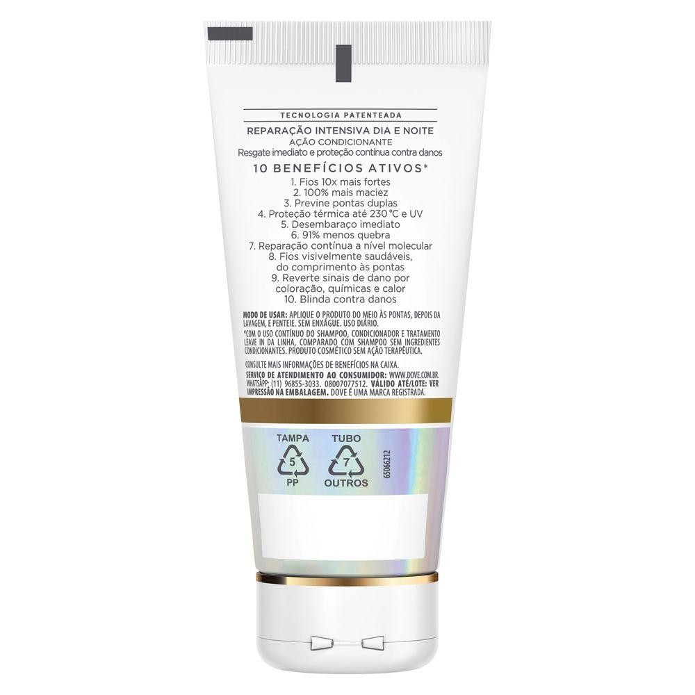 "•Dove Leave-In Bond Intense Repair com Peptídeos é um finalizador para reconstrução e proteção dos fios que age dia e noite garantindo cabelos 10X mais fortes* •Tratamento sem enxágue com 6% Peptídeo Complex que repara ligações internas a nível molecular e reduz a quebra •Leave-in ideal para cabelos danificados e porosos, entrega 10 benefícios ativos em uma única aplicação, incluindo proteção térmica de até 230?°C e filtro UV •Reconstrutor com ação fortalecedora combina Tecnologia Bio-Protein fruto de mais de 10 anos de pesquisa para regenerar 90% da proteína do fio •Perfeito para uso diário, desembaraça instantaneamente, previne pontas duplas, controla frizz e potencializa resultados da linha Dove Bond Intense Repair Dove Leave-In Bond Intense Repair + Peptídeo é o aliado perfeito para quem busca um finalizador para reconstrução e proteção dos fios sem enxágue. Sua fórmula leve age continuamente, reparando danos e blindando contra agressões diárias. Com 6% Peptídeo Complex e a patenteada Tecnologia Bio-Protein, desenvolvida por mais de 10 anos, o produto atua a nível molecular, reconectando pontes proteicas, fortalecendo a fibra e deixando o cabelo 10x mais forte*. Este leave-in para cabelo danificado e poroso oferece 10 benefícios ativos em uma única passada: força, maciez, prevenção de pontas duplas, proteção térmica até 230?°C e UV, desembaraço imediato, 91% menos quebra, reparação contínua, fios saudáveis do comprimento às pontas, reversão de danos da química, calor e blindagem contra novas agressões. Indicado para todos os tipos de cabelo fragilizado, o tratamento sem enxágue pode ser usado diariamente, antes do secador ou ao natural. Para resultados máximos, use regime completo Dove Bond Intense Repair + Peptídeo. *Com o uso contínuo do shampoo, condicionador e tratamento leave-in da linha, comparado com shampoo sem ingredientes condicionantes."
