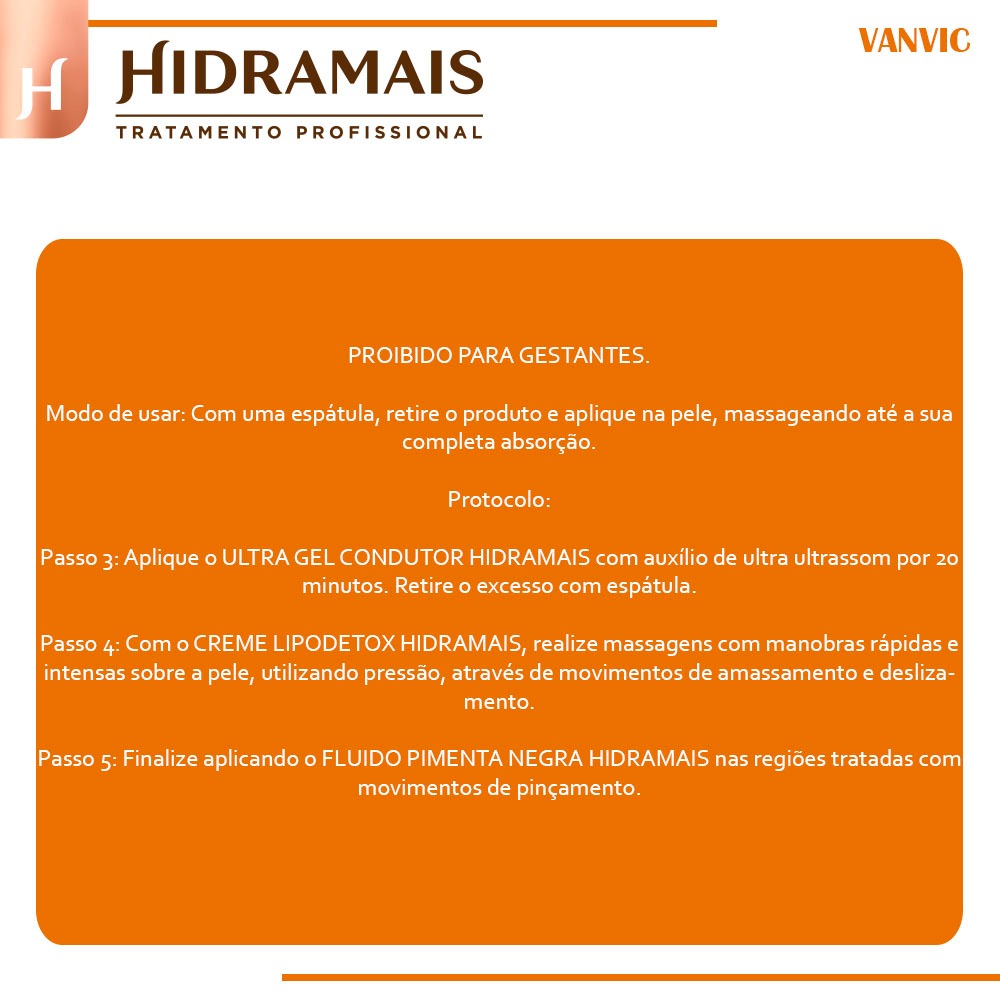 ITENS INCLUSOS: - 1 Creme para Massagem Firming Detox Hidramais 1kg. Produto 100% Original, com garantia e nota fiscal. O creme para Massagem LipoDetox Hidramais ajuda a potencializar resultados de diversos tratamentos estéticos. Sua fórmula rica em ativos ajuda na redução de medidas e é sem testes em animais. O que ele faz? O creme para Massagem LipoDetox Hidramais atua na quebra de gordura localizada, combate a flacidez, reduz o inchaço e a retenção de líquidos. Tem ação desintoxicante e auxilia o processo de lipólise. O que ele tem? Sua fórmula contém cafeína pura, laranja amarga e óleo de café verde. Como usar? Não permitido para gestantes. Com uma espátula, retire o produto e aplique na pele, massageando até a sua completa absorção. Protocolo Passo 1: Realize a higienização com o FLUIDO PREBIÓTICO HIGIENIZANTE HIDRAMAIS. Passo 2: Com o GEL ESFOLIANTE HIDRAMAIS, esfolie as regiões a serem tratadas com movimentos circulares até obter a esfoliação desejada. Retire o excesso com toalha seca. Passo 3: Aplique o ULTRA GEL CONDUTOR HIDRAMAIS com auxílio de ultra ultrassom por 20 minutos. Retire o excesso com espátula. Passo 4: Com o CREME LIPODETOX HIDRAMAIS, realize massagens com manobras rápidas e intensas sobre a pele, utilizando pressão, através de movimentos de amassamento e deslizamento. Passo 5: Finalize aplicando o FLUIDO PIMENTA NEGRA HIDRAMAIS nas regiões tratadas com movimentos de pinçamento.