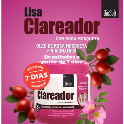 Creme Lisa Clareador Rosa Mosqueta 120g O Lisa Clareador Bio Soft atua diretamente nos processos de produção, formação e distribuição da pigmentação da pele, proporcionando um tom mais equilibrado, iluminado e com toque sedoso. Sua fórmula leve e hidratante contém Óleo de Rosa Mosqueta e Niacinamida, sendo ideal para uso diário agindo na uniformização do tom da pele e suavização de marcas e sinais visíveis causados por atrito, exposição solar, tempo e pequenas agressões. O produto foi dermatologicamente avaliado, e a amostra testada não apresentou eventos adversos na avaliação clínica. • Resultados visíveis a partir de 7 dias de uso, variando conforme o nível de escurecimento da área. • Clareamento gradual e uniformização do tom da pele. • Reduz a aparência opaca e escurecida da região aplicada. • Pele mais luminosa, uniforme e com aspecto saudável. • Ideal para áreas com hiperpigmentação. Os resultados começam a surgir em 7 dias, mas há variações de níveis de superficialidade de cada área escurecida. Se for mais clara e superficial, o produto agirá mais rápido. Já se for mais profunda e escura, os resultados podem demorar um pouco mais para serem notados. Para potencializar os resultados, indicamos que mantenha alguns hábitos, como: 1) Manter a pele hidratada e protegida com filtro solar; 2) Esfoliar a região pelo menos uma vez na semana Validade: 24 meses a partir da data de fabricação indicada na embalagem. Indicação de uso: Indicado para uso na virilha, axilas e áreas com hiperpigmentação como cotovelos e joelhos. Utilizar até 3x ao dia. Pode ser usado em todos os tipos de pele. Uso adulto. Não recomendado para gestantes ou lactantes sem orientação médica. Modo de uso: Utilizar até 3x ao dia, preferencialmente após o banho no período da noite. Com a área limpa e seca, aplique uma pequena quantidade do produto espalhando bem para facilitar a penetração. Uso diário. Segurança e Cuidados: Produto dermatologicamente avaliado, sem registro de irritações ou eventos adversos na amostra testada. Evite usar sobre pele lesionada, irritada ou recém-depilada. Caso ocorra irritação, suspenda o uso. Uso externo. Mantenha fora do alcance de crianças. Atenção: As listas de ingredientes dos produtos são regularmente atualizadas. Por isso, incentivamos você a verificar os ingredientes na embalagem do seu produto para assegurar que os componentes são adequados ao seu uso pessoal. Ingredientes: Aqua (Água), Alpinia Officinarum Root Extract (Extrato da Raiz da Galanga), Rosa Canina Fruit Oil (Óleo do Fruto de Rosa-Mosqueta), Niacinamide (Nicotinamida), Lecithin (Lecitina), Maltodextrin (Maltodextrina), Xylitol (Xilitol), Caprilyc Acid (Ácido Caprílico), Caprylyl Glycol (Caprililglicol), Parfum (Perfume), Butylphenyl Methylpropional (Butilfenil Metilpropional), Benzyl Salicylate (Salicilato de Benzila), Citronellol (Citronelol), Hexyl Cinnamal (Hexil Cinamal), Linalool (Linalol), Cetrimonium Chloride (Cloreto de Cetrimônio), Alcohol (Álcool Etílico), Hydroxyethyl Urea (Hidroxietil Uréia), Urea (Ureia), Paraffinum Liquidum (Parafina Líquida), Glycerin (Glicerol), Phenoxyethanol (Fenoxietanol), Methylparaben (Metilparabeno), Ethylparaben (Etilparabeno), Propylparaben (Propilparabeno), Butylparaben (Butilparabeno), Ceteareth-20 (Cetearete-20), Cetearyl Alcohol (Álcool Cetearílico), Citric Acid (Ácido Cítrico).