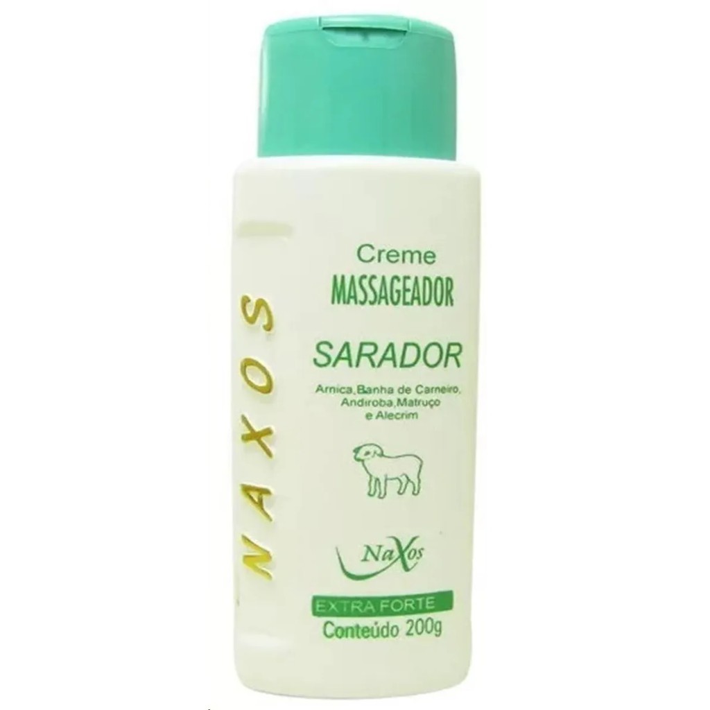 Creme Massageador Sarador Extra Forte - 200G - Naxos Proporciona uma agradável sensação de refrescância e bem estar além de seus benefícios terapêuticos atuando em dores crônicas, entorces, contusões e outras. Sugestão de Uso: Aplique e massageie suavemente a área desejada Composição: Arnica, Banha de Carneiro, Andiroba, Mastruço, e Alecrim Uso Externo. Precauções Não aplicar sobre pele irritada ou mucosas.