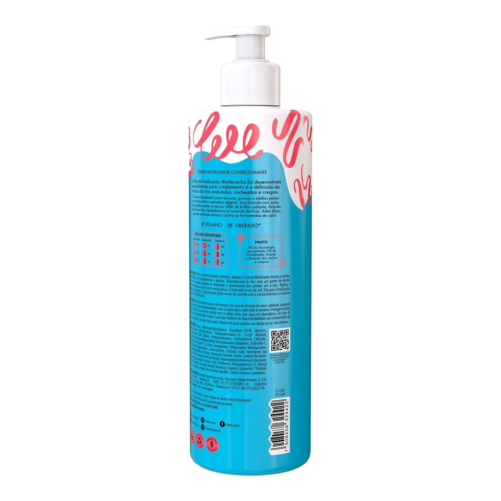 O Creme Modelador #todecacho Cachos dos Sonhos Fixação Natural garante 72h de definição e fixação, 100h de brilho radiante com efeito gloss, além de controle do frizz e proteção térmica de até 230º. <>INDICAÇÕES$& Para quais tipos de cabelo? Cabelos ondulados, cacheados e crespos. Qual a indicação? Cabelos opacos e altamente secos. Pode usar a partir de quantos anos? A partir de 12 anos. <>ATIVOS$& Quais os principais ativos? O Creme Modelador possui provitamina B5 e queratina vegetal. Sua fórmula com ação extracondicionante promove 100h de brilho radiante, fixação flexível dos fios, desembaraço e controle de frizz. Além disso, garante proteção térmica contra as ferramentas de calor. <>MODO DE USO$& Qual a melhor forma de usar? Com os cabelos limpos e úmidos, aplique o Creme Modelador mecha a mecha,uniformemente, no comprimento e pontas. Desembarace os os com um pente de dentes largos e, em seguida, amasse-os iniciando o movimento das pontas até a raiz. Repita o movimento quantas vezes forem necessárias. É indicado o uso de até 30g para nalização, penteados e baby hair. A quantidade pode variar de acordo com o comprimento e o volume de cabelo. Não precisa enxaguar. <>CARACTERÍSTICAS$& É produto vegano? O produto é vegano. É liberado? O produto é liberado.