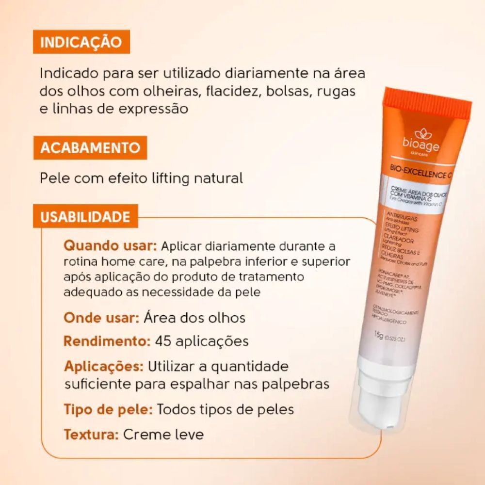 | Creme para Área dos Olhos Com Vitamina C Bio-Excellence C - 15g Bioage este produto | R$ 198,00 | — | 5.0/5 | — |