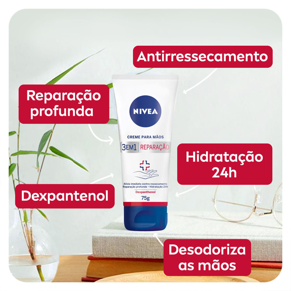 O Nivea Creme Para as Mãos 3 em 1 Reparação proporciona hidratação por 24 horas, além de reparar e proteger a pele das suas mãos do ressecamento. Nivea Hidratante 3 em 1 Reparação com dexpanthenol possui uma embalagem prática, fácil de carregar para qualquer lugar e manter suas mãos sempre bem cuidadas e livres do ressecamento. Com fórmula leve e de rápida absorção, é o cuidado diário que suas mãos precisam. Nivea Hidratante 3 em 1 Reparação possui dexpanthenol, um poderoso ativo hidratante que proporciona alívio imediato e maciez para suas mãos. Benefícios: - Hidratação por 24 horas; - Reparar e proteger a pele; - Rápida absorção. Modo de usar: Aplique 4 vezes ao dia ou sempre que necessário sobre as mãos limpas e massageie bem. Sobre a marca: Nivea é uma marca de pele e de higiene corporal global, de produtos cosméticos. A empresa foi fundada em 28 de março de 1882 do farmacêutico Paul Carl Beiersdorf. Em 1900, o novo proprietário Oscar Troplowitz, o químico Isaac Lifschütz e o dermatologista Paul Gerson Unna, foram os inventores do primeiro creme hidratante da história, em 1911. Eles desenvolveram uma emulsão de água-em-óleo, como um creme para a pele com Eucerit, a primeira emulsão estável do tipo. Esta foi a base para o Eucerin e depois, Nivea.1 É uma das marcas de cuidado com a pele mais confiáveis no mundo inteiro.