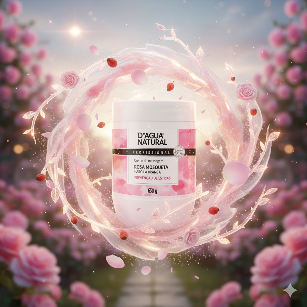 Creme Para Corpo D’Água Natural Profissional Rosa Mosqueta com Argila Branca 650g O Creme Corporal D’Água Natural Rosa Mosqueta com Argila Branca foi desenvolvido especialmente para hidratar profundamente, revitalizar e suavizar a pele, proporcionando toque macio e aparência saudável. Sua fórmula contém óleo de rosa mosqueta, conhecido por suas propriedades regeneradoras e nutritivas, que auxiliam na renovação celular e na prevenção de estrias e manchas, enquanto a argila branca atua como purificante e remineralizante, deixando a pele mais firme e luminosa. Ideal para massagens corporais, hidratações e tratamentos estéticos profissionais, o produto tem textura cremosa e de fácil absorção, garantindo deslizamento suave durante o uso e resultado imediato de maciez e conforto. 🌸 Benefícios Hidrata e nutre intensamente a pele Auxilia na regeneração e uniformização do tom Melhora a firmeza e a textura da pele Indicado para todos os tipos de pele Uso profissional e domiciliar Textura leve e de rápida absorção 💆♀️ Modo de Uso Aplique uma quantidade suficiente do creme sobre a pele limpa e seca. Massageie com movimentos suaves e circulares até completa absorção. Para uso profissional, pode ser aplicado durante massagens corporais ou protocolos estéticos. 📦 Conteúdo Quantidade: 650g Marca: D’Água Natural Linha Profissional