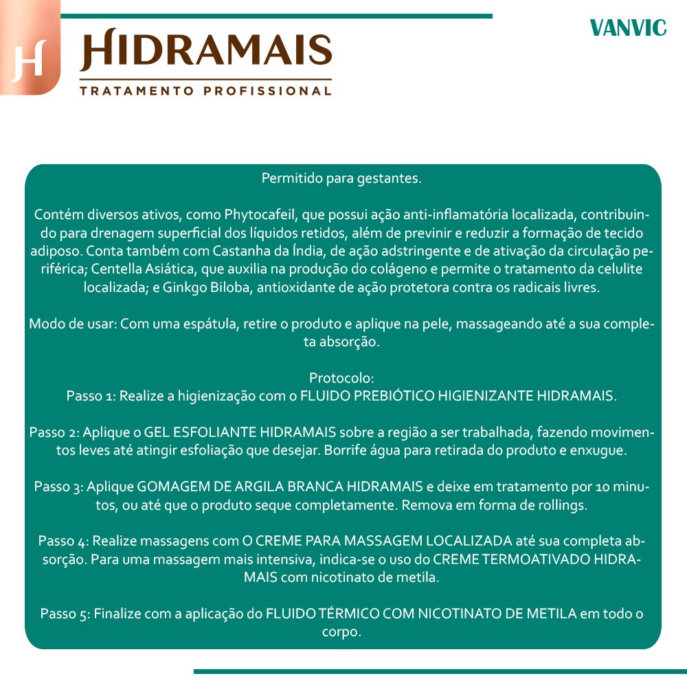 ITENS INCLUSOS: - 1 Creme de massagem localizada Hidramais 1kg. Produto 100% Original, com garantia e nota fiscal. O Creme para Massagem Localizada Hidramais possui uma alta concentração de ativos com ações anti-inflamatórias, antioxidante e redutora. Indicado para tratamentos estéticos de remodelagem corporal. Produto sem teste em animais e dermatologicamente testado. O que ele faz? O Creme para Massagem Localizada Hidramais age ativando a microcirculação, prevenindo o aparecimento de estrias e varizes, além de eliminar a retenção de líquido. O que ele tem? Contém diversos ativos, como Phytocafeil, que possui ação anti-inflamatória localizada, contribuindo para drenagem superficial dos líquidos retidos, além de previnir e reduzir a formação de tecido adiposo. Conta também com Castanha da Índia, de ação adstringente e de ativação da circulação periférica; Centella Asiática, que auxilia na produção do colágeno e permite o tratamento da celulite localizada; e Ginkgo Biloba, antioxidante de ação protetora contra os radicais livres. Como usar? Permitido para gestantes. Modo de usar: Com uma espátula, retire o produto e aplique na pele, massageando até a sua completa absorção. Protocolo: Passo 1: Realize a higienização com o FLUIDO PREBIÓTICO HIGIENIZANTE HIDRAMAIS. Passo 2: Aplique o GEL ESFOLIANTE HIDRAMAIS sobre a região a ser trabalhada, fazendo movimentos leves até atingir esfoliação que desejar. Borrife água para retirada do produto e enxugue. Passo 3: Aplique GOMAGEM DE ARGILA BRANCA HIDRAMAIS e deixe em tratamento por 10 minutos, ou até que o produto seque completamente. Remova em forma de rollings. Passo 4: Realize massagens com O CREME PARA MASSAGEM LOCALIZADA até sua completa absorção. Para uma massagem mais intensiva, indica-se o uso do CREME TERMOATIVADO HIDRAMAIS com nicotinato de metila. Passo 5: Finalize com a aplicação do FLUIDO TÉRMICO COM NICOTINATO DE METILA em todo o corpo.