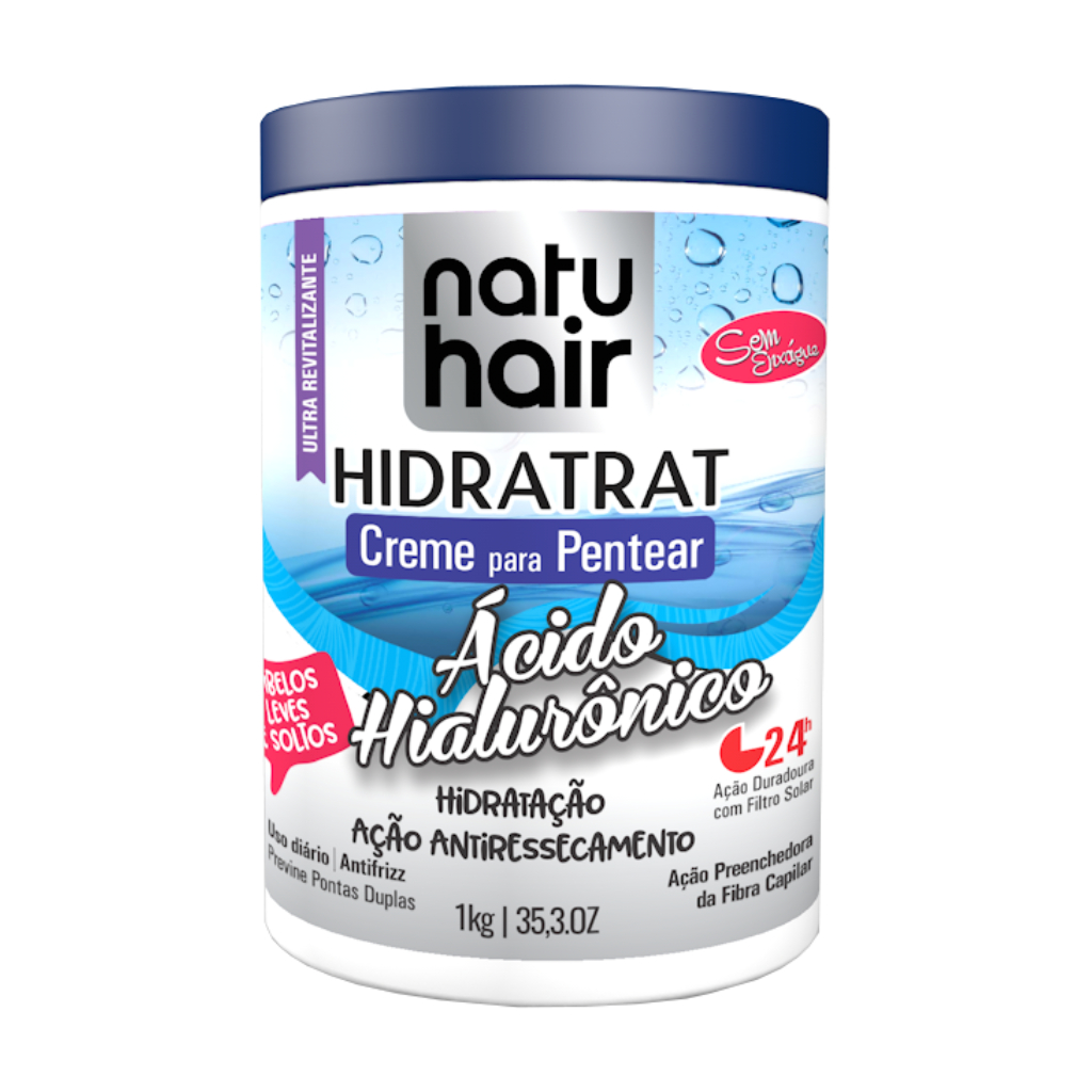 Creme Para Pentear - Ácido Hialurônico O Creme para Pentear NatuHair Ácido Hialurônico foi desenvolvido especialmente para prevenir o ressecamento dos fios. Ele protege a fibra capilar e evita a abertura das cutículas, retendo o tratamento. Com seu alto poder de hidratação, previne pontas duplas e sela as cutículas deixando os cabelos desembaraçados, leves, soltos e saudáveis. Ideal para ser usado diariamente. Rico em Vitaminas D-Pantenol e Ácido Hialurônico. Alto Poder de Hidratação AÇÃO CONDICIONANTE Ativos: D-Pantenol: Hidrata profundamente a fibra capilar Ácido Hialurônico: Alto poder reparador Modo de usar: Aplique nos cabelos úmidos ou secos, espalhando uniformemente por toda extensão dos fios. Não enxágue e penteie como de costume. Precauções: Uso externo. MANTER FORA DO ALCANCE DAS CRIANÇAS e em local fresco e ventilado. Evite contato com os olhos. Em caso de contato com os olhos, lave com bastante água e, se necessário, procure orientação médica. Não aplique caso o couro cabeludo apresentar irritações ou escoriações. Havendo irritação, suspenda o uso e procure orientação médica. Não utilize caso tenha alergia a qualquer componente da formulação ou caso o produto apresente alteração em seu aspecto. A utilização desse produto de forma inadequada poderá causar reações adversas. Não reaproveite a embalagem. Não ingerir. Composição: Aqua, Glycerin, Cetearyl Alcohol, cetrimonium Chloride, Paraffinum Liquidum, Phenoxyethanol, Behentrimonium Methosulfate, Panthenol, Linalool, Glyceryl Stearate, Sodium Hyaluronate, Parfum, Ethylhexyl Methoxycinnamate, Disodium EDTA, Hydroxyetylcellulose, d-Limonene, Hexyl Cinnamal, BHT.