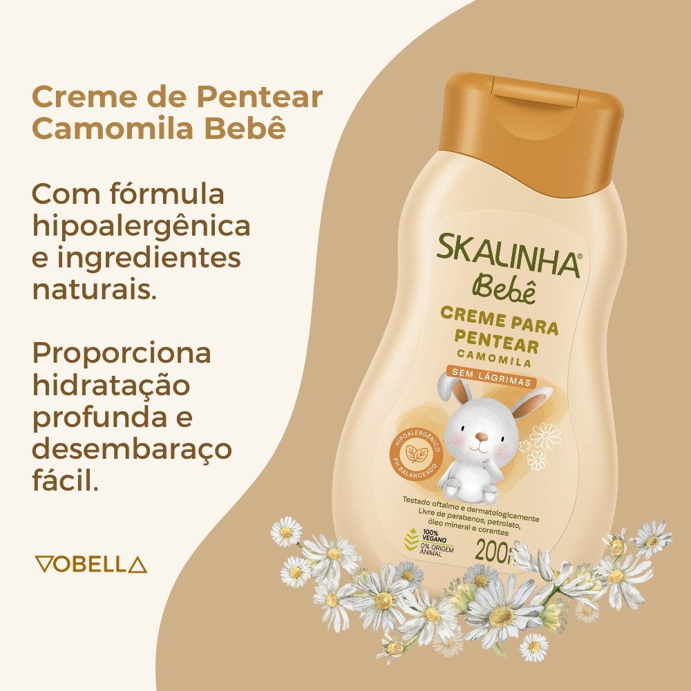 O Creme Para Pentear Camomila Bebê Infantil Vegano Skala 200ml é perfeito para cuidar dos cabelos delicados do seu bebê. Proporciona hidratação profunda, desembaraço fácil e proteção contra o ressecamento. Com fórmula vegana, hipoalergênica e sem lágrimas, garante cuidado seguro e suave para os pequenos, transformando a rotina diária em um momento de carinho. Sobre o produto: - Creme Para Pentear Camomila Bebê Infantil. - Livre de sal, sulfato, parabenos e corantes. - Testado dermatologicamente e oftalmologicamente. - Hipoalergênico. - Ph balanceado. - Vegano. - Sem lágrimas. Indicado para: - Bebês e crianças acima de 3 anos. - Cabelos delicados e com tendência a embaraçar. Modo de uso: - Com o cabelo limpo e levemente úmido, aplique uma pequena quantidade do creme nas mãos. - Distribua suavemente nos fios, especialmente nas pontas e áreas com mais embaraço. - Penteie delicadamente com pente ou escova própria para bebês. - Não enxágue; deixe o creme agir para manter os fios hidratados e perfumados. - Pode ser usado diariamente ou após cada lavagem para melhores resultados. Com o Creme Para Pentear Camomila Bebê Infantil Vegano Skala 200ml, os fios do seu bebê ficam macios, hidratados e com um cheirinho suave de camomila, tornando a hora do cuidado ainda mais especial. Surgiu alguma dúvida? Entre em contato com a gente! Boas Compras :)