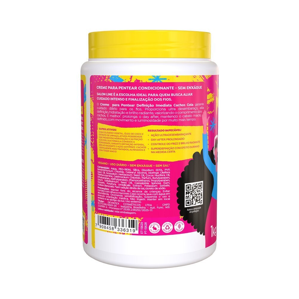 O creme para pentear Definição Imediata Cachos Cola Salon Line foi desenvolvido para quem busca cuidado intenso e finalização eficaz desde a primeira aplicação. Indicado para cabelos cacheados, crespos e em transição, especialmente fios sem definição, opacos e com frizz, ele promove definição de cacho imediata, ajudando a manter os fios alinhados e com brilho radiante. <>INDICAÇÕES$& Para quais tipos de cabelo? Cabelos ondulados, cacheados e crespos. Qual a indicação? Para cabelos sem definição, com frizz e opaco. Pode usar a partir de quantos anos? A partir de 12 anos. <>ATIVOS$& Quais os principais ativos? Com Colágeno Vegetal, Óleo de Coco e Extrato de Linhaça, ativos poderosos que promovem hidratação e nutrição aos fios. Sua fórmula combate a porosidade, garante definição intensa, brilho radiante e ação antifrizz. Cachos visivelmente mais tratados, alinhados e com toque macio. <>MODO DE USO$& Qual a melhor forma de usar? Com os cabelos limpos e úmidos, aplique o creme para pentear mecha a mecha, uniformemente, no comprimento e nas pontas. Desembarace com um pente de dentes largos e, em seguida, amasse os fios das pontas até a raiz. Repita o movimento quantas vezes quiser para ativar bem os cachos. Não Enxague. <>CARACTERÍSTICAS$& É produto vegano? O Creme Para Pentear Definição Imediata Cachos Cola é vegano. É liberado? O Creme Para Pentear Definição Imediata Cachos Cola é liberado.