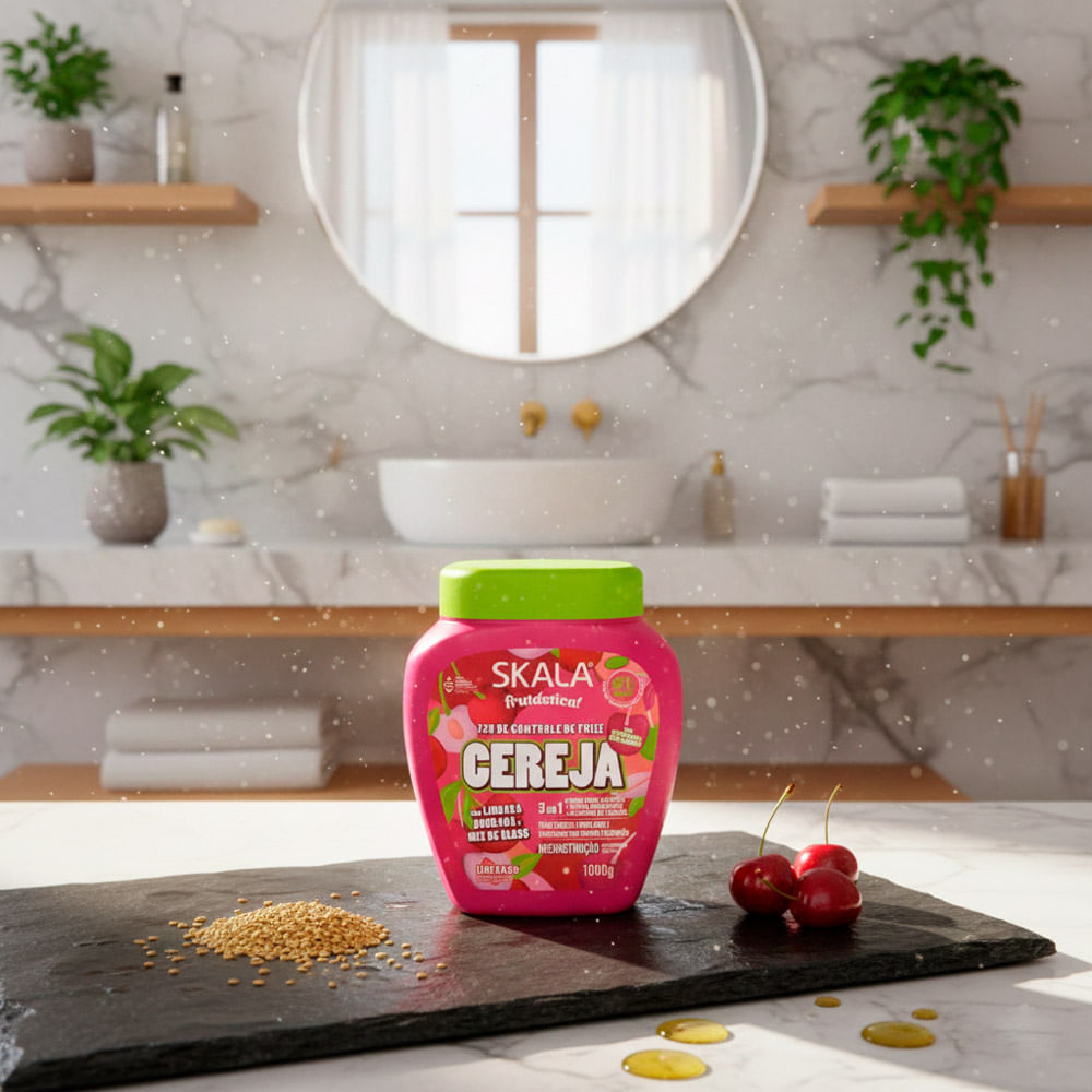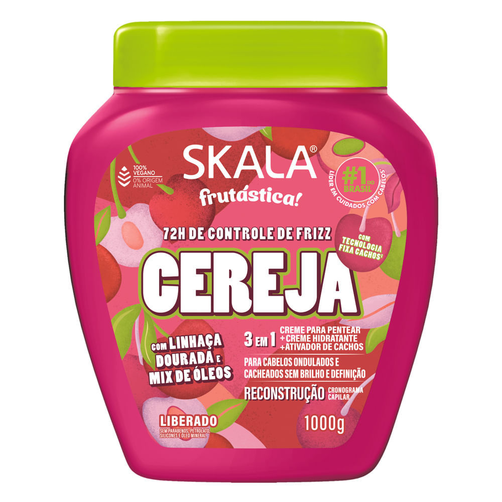 Creme 3 em 1 Skala Frutástica Cereja, Linhaça e Mix de Óleos 1kg – Reconstrução e Definição Recupere o brilho e a definição dos seus fios com o poderoso Creme 3 em 1 Skala Frutástica Cereja. Desenvolv