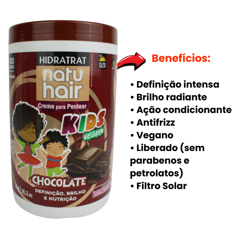 Creme Para Pentear Natuhair Hidratrat Chocolate - Kids Vegano 1kg O Creme para Pentear NatuHair Kids Chocolate chegou para transformar a rotina de cuidados dos pequenos! Perfeito para cabelos cacheados, crespos e delicados, ele é o aliado ideal para manter os fios saudáveis, definidos e com um brilho incrível todos os dias. 💜 Definição dos cachos: Cachinhos definidos, brilhosos e com um toque super macio. 💧 Hidratação: A poderosa combinação de Manteiga de Karité, D-Pantenol e Óleo de Coco hidrata e combate o frizz deixando os cachinhos definidos e saudáveis o dia todo. ✨ Brilho e nutrição: A fórmula delicada oferece nutrição intensa, hidratando os fios e promovendo um brilho radiante, enquanto fortalece os cabelos das crianças, deixando-os fortes e protegidos. NatuHair Kids Chocolate é o aliado perfeito para o cuidado diário, deixando os cachinhos perfumados com um doce aroma de chocolate. Modo de usar: Com os cabelos úmidos, aplique o Creme para Pentear NatuHair Kids Chocolate, mecha a mecha uniformemente do comprimento às pontas, desembaraçando os fios, em seguida “amasse” os cabelos com movimentos de baixo para cima. Não enxágue. Dicas de finalização: Para evitar aquele efeito de falsa caspa, sugerimos a aplicação mecha a mecha como explica o modo de uso, em seguida, amasse com uma toalha, tirando o excesso de produto dos fios. E tenha cachos e crespos super definidos e radiantes. Day After: Para garantir definição, hidratação e nutrição dos cachinhos, no dia seguinte, misture em seu borrifador água e o creme para Pentear NatuHair Kids Chocolate. Aplique sobre os fios do comprimento às pontas. Caso queira uma finalização rápida, espalhe um pouco do produto na palma das mãos e amasse os cachos de baixo para cima.