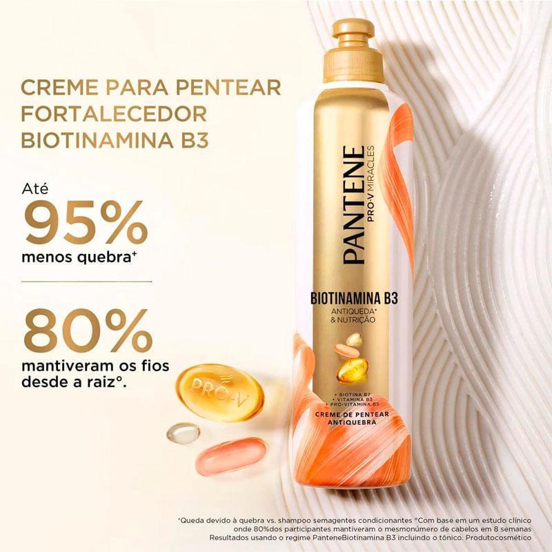Creme para Pentear Pantene Biotinamina B3 - Antiqueda+ e Nutrição Fios capilares quebradiços, elásticos e porosos? Apresentamos o Creme para Pentear Antiquebra Pantene Biotinamina B3. Ajuda a manter seu cabelo Pantene! Com a linha Pantene Biotimina B3 você consegue um cabelo saudável, e queda reduzida. Com Biotina B7, Vitamina B3 e Pro-Vitamina B5, reduz a queda em até 95% e até 80% menos quebra desde a raíz. O Creme para Pentear Antiquebra Pantene proporciona fios mais fortes, macios e saudáveis. Conta com efeito anti-frizz e pH balanceado, reforçando a estrutura capilar. Para melhores resultados, use a linha completa Pantene Biotinamina B3. Benefícios - Fórmula enriquecida com Biotina B7, Vitamina B3 e Pro-Vitamina B5 - Cabelo visivelmente saudável de dentro para fora - Efeito anti-frizz, macio e definido e pH balanceado. Diferenciais - Fórmula mix vitamínico com Biotina B7, vitamina B3 - Pro-Vitamina B5 sua dose diária de vitaminas para um cabelo saudável, bonito e com menos queda - Reforça a estrutura interna dos fios - Proporciona Resistência e extende a vida capilar Modo de Uso Com os cabelos limpos e úmidos, coloque uma quantidade que seja suficiente para o comprimendo dos cabelos. Aplique do comprimento até as pontas. Para melhores resultados, utilize a linha completa de Pantene Biotinamina B3. De shampoos e condicionadores a tratamentos especiais, cada fórmula é desenvolvida para nutrir, hidratar e fortalecer os fios, garantindo cabelos mais saudáveis e bonitos. Descubra a linha de produtos Pantene e encontre a opção ideal para o seu tipo de cabelo e necessidades.