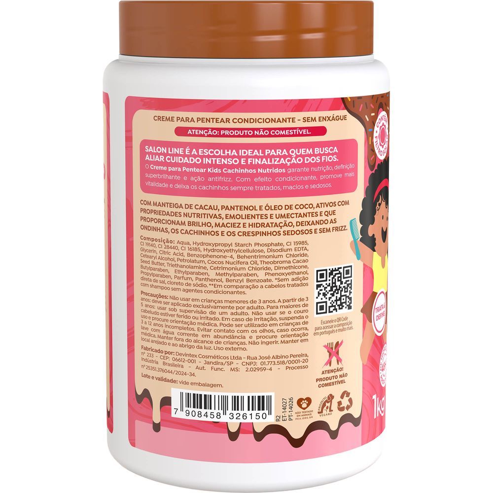 O Creme Para Pentear Salon Line Kids Cachinhos Nutridos Chocolate foi desenvolvido para garantir nutrição, definição superbrilhante e ação antifrizz aos cabelos. Com efeito condicionante, promove mais vitalidade e mantém os cachinhos sempre tratados, macios e sedosos. Sua fórmula contém manteiga de cacau, pantenol e óleo de coco, ativos com propriedades nutritivas, emolientes e umectantes, que proporcionam brilho, maciez e hidratação, deixando as ondinhas, os cachinhos e os crespinhos sedosos e sem frizz. Além disso, contém filtro solar para proteger os fios. É dermatologicamente testado e conta com um irresistível aroma de chocolate, tornando cada aplicação uma experiência agradável para as crianças. Benefícios: - Nutrição; - Hidratação; - Ação antifrizz; - Proteção solar; - Brilho e maciez; - Aroma agradável de chocolate; - Dermatologicamente testado. Modo de usar: Com os cabelos limpos e úmidos, aplique o creme para pentear mecha a mecha, distribuindo uniformemente no comprimento e nas pontas. Desembarace os fios e, em seguida, amasse-os com as mãos, fazendo movimentos das pontas em direção à raiz. A quantidade ideal pode variar conforme o comprimento e o volume dos cabelos. Não é necessário enxaguar. Sobre a Marca: A Salon Line, uma das maiores fabricantes de cosméticos do Brasil, acompanha a evolução da mulher brasileira há mais de 15 anos. Toda essa vivência faz da empresa uma profunda conhecedora do universo feminino. A Salon Line está sempre investindo em novas tecnologias e produtos para oferecer o que há de melhor no segmento cosmético mundial. Empresa 100% Nacional, tem como objetivo especializar-se na beleza das mulheres brasileiras, desenvolvendo produtos de alta tecnologia e valorizando todas as belezas.