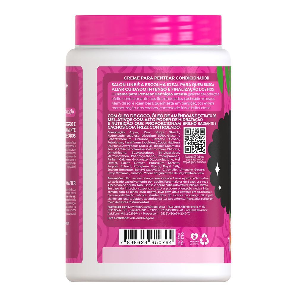 O Creme para Pentear Definição Intensa é formulado com ativos poderosos que proporcionam uma definição perfeita dos cachos, deixando os cabelos com um brilho incrível e fácil de desembaraçar. Sua ação vai além da definição, promovendo uma hidratação profunda, controle eficaz do frizz, e garantindo fios mais saudáveis e disciplinados. Com uma embalagem de 1kg, ele rende até 30 aplicações, sendo ideal para quem busca praticidade e resultados profissionais em casa. Benefícios: - Definição intensa dos cachos; - Brilho e desembaraço dos fios; - Controle eficaz do frizz; - Hidratação profunda e duradoura. Modo de usar: Aplique o creme nos cabelos úmidos, distribuindo bem o produto por todo o comprimento. Finalize como preferir, amassando os cachos ou modelando os fios. Não é necessário enxaguar. Sobre a marca: A Salon Line, uma das maiores fabricantes de cosméticos do Brasil, acompanha a evolução da mulher brasileira há mais de 15 anos. Toda essa vivência faz da empresa uma profunda conhecedora do universo feminino. A Salon Line está sempre investindo em novas tecnologias e produtos para oferecer o que há de melhor no segmento cosmético mundial. Empresa 100% Nacional, tem como objetivo especializar-se na beleza das mulheres brasileiras, desenvolvendo produtos de alta tecnologia e valorizando todas as belezas.
