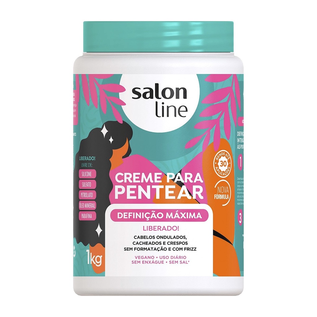 O Creme para Pentear Definição Máxima proporciona definição, hidratação para o cabelo, brilho, desembaraço e controle do frizz em uma embalagem de 1kg, que rende até 30 aplicações. É produto vegano? O Creme para Pentear Definição Máxima é vegano. É liberado? O Creme para Pentear Definição Máxima é liberado: não contém sulfato, parafina, petrolato, silicone, óleo mineral, conservantes e sal. Contém parabenos. Principais Ativos Água de rosas: rica em vitamina A e com propriedades antioxidantes, o ativo hidrata e fortalece o cabelo. Além disso, garante brilho, selamento das pontas duplas e cabelo macio. Água de coco: rica em vitaminas e sais minerais, repõem os nutrientes dos fios e potencializa a hidratação, garantindo um cabelo sedoso, brilhante e sem frizz. Auxilia também no crescimento saudável e no fortalecimento das fibras capilares. Babosa: com propriedades regeneradoras e rica em aminoácidos e vitaminas para os fios, é um excelente antioxidante natural que atua na reestruturação das fibras capilares, hidratando e selando os fios. Também auxilia no combate contra a queda. Modo de Uso Aplique o Creme para Pentear Definição Máxima no cabelo úmido e espalhe mecha a mecha, do comprimento às pontas. Em seguida, desembarace com um pente de dentes largos e, depois, amasse de baixo para cima. Repita este movimento quantas vezes desejar. Se quiser controle de volume, aplique na raiz. Dicas de uso Para evitar aquele aspecto de falsa caspa, aplique o produto mecha a mecha e, em seguida, amasse com uma toalha, eliminando o excesso de creme dos fios. Salon Line recomenda Se desejar uma definição mais duradoura no Day After, misture em seu borrifador água e o Creme de Pentear Salon Line. Aplique sobre os fios, do comprimento às pontas. Caso queira controlar o volume, aplique também próximo à raiz.