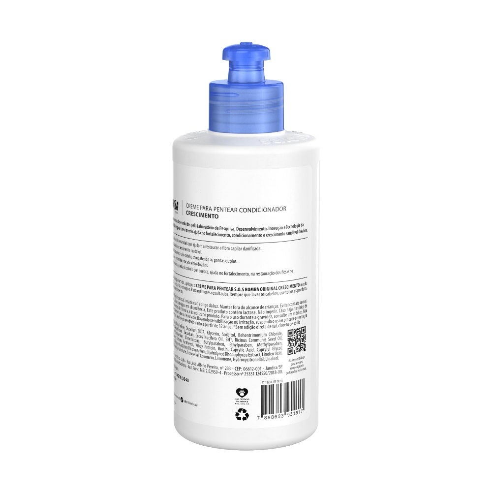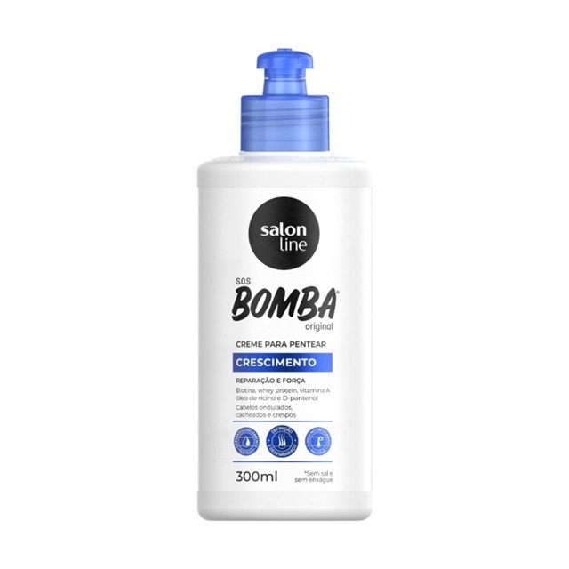 Ah, e a fórmula também ajuda o cabelo a crescer mais forte e saudável, além de reduzir a queda por quebra! S.O.S Bomba Original oferece ativos que vão ajudar nos cuidados diários dos cabelos sejam eles lisos, ondulados, cacheados ou crespos. Modo de Usar: Com o cabelo limpo e úmido, aplique o Creme para Pentear S.O.S Bomba Original