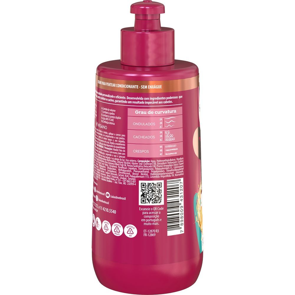 O Creme Para Pentear Salon Line SOS Cachos + Poderosos proporciona cachos macios e definidos. Indicado para cabelos cacheados e crespos, foi especialmente formulado com ativos inteligentes e tecnológicos que tratam o cabelo ao longo do dia. A poderosa combinação de ingredientes como microqueratina, silicone e proteína do arroz recupera, trata e reconstrói os fios danificados, proporcionando máxima resistência, brilho e movimento natural. O Creme para Pentear S.O.S Cachos 10 em 1 Multibenefícios promove desembaraço reparação e brilho extremos. 10 benefícios em um único produto:br/> 1- Blindagem do frizz; 2- Reparação imediata; 3- Hidratação Intensa; 4- Umectação absoluta; 5- Brilho extremo; 6- Controle de volume; 7- Redução da quebra; 8- Redução das pontas duplas; 9- Ação Anti-flake; 10- Proteção total. Modo de usar: Com cabelos limpos e úmidos, aplique o Creme de Pentear mecha a mecha, da raiz às pontas. Podendo fazer fitagem com os dedos ou um pente de dente largo e, em seguida amasse os fios para auxiliar na formação de cachos. Para melhores resultados, use a linha completa S.O.S Cachos + Poderosos Salon Line. Sobre a Marca: A Salon Line é uma das maiores fabricantes de cosméticos do Brasil. Há mais de 15 anos, acompanha a evolução da mulher brasileira. Essa experiência fez da empresa uma especialista no universo feminino. Sempre investindo em novas tecnologias e produtos, a Salon Line oferece aos consumidores e profissionais o que há de melhor no mercado cosmético mundial. Uma empresa 100% nacional, especializada na beleza das mulheres brasileiras.