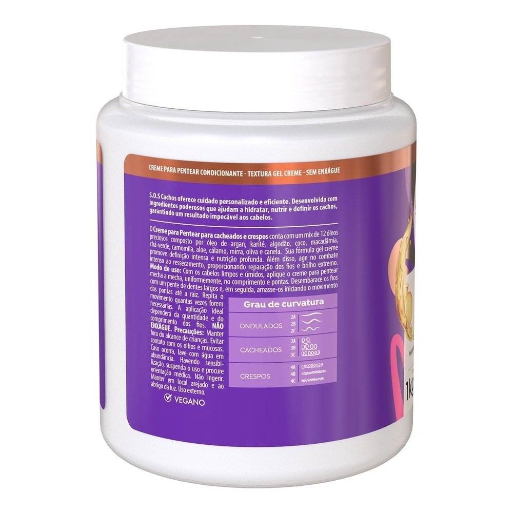 Características do produto: Marca: Salon Line Linha: SOS Cachos Volume: 1Kg Especificações gerais: Principais Ativos: Super óleos: A combinação entre os óleos de argan, karité, algodão, coco, macadâmia, chá verde, camomila, aloe, cálamo, mirra, oliva e canela. Sua fórmula cremosa promove umectação profunda e nutrição extraordinária dos fios. Modos de Uso: Com os cabelos limpos e úmidos, aplique o Creme para Pentear mecha a mecha, uniformemente, no comprimento e pontas. Desembarace os fios com um pente de dentes largos e, em seguida, amasse-os iniciando o movimento das pontas até a raiz. Repita o movimento quantas vezes forem necessárias. A aplicação ideal dependerá da quantidade e do comprimento dos fios. Não enxágue. Produto vegano. Fornecedor: Salon Line