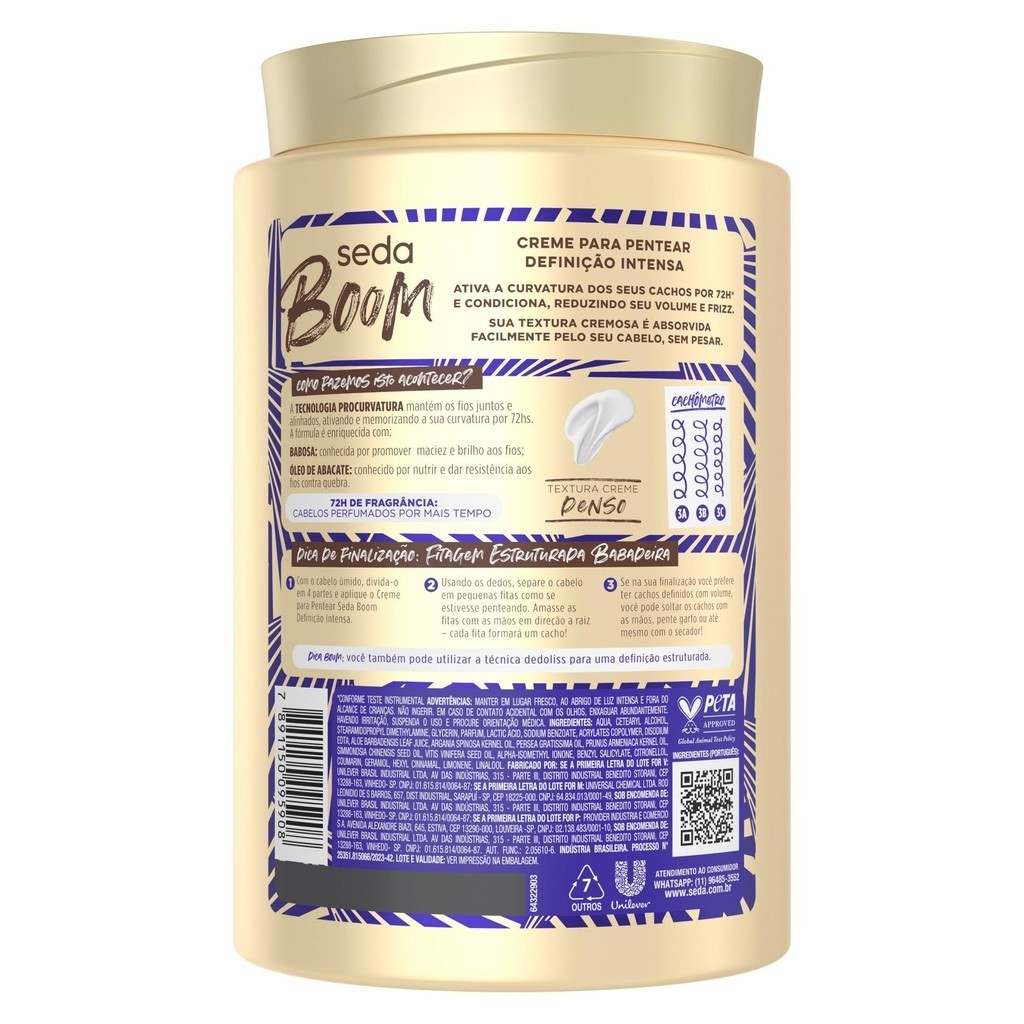 • O Creme para Pentear Seda Boom Definição Intensa possui exclusiva tecnologia ProCurvatura, que mantém os fios juntos e alinhados, ativando e memorizando a curvatura do cabelo por 72 horas • A fórmula desse creme para pentear é enriquecida com babosa, que promove maciez e brilho aos fios, e óleo de abacate, que nutre e dá resistência aos fios contra quebra • Creme para definição que ativa a curvatura dos seus cachos por 72h*, reduzindo seu volume e frizz, sem pesar • Este creme para pentear Seda Boom possui uma fragrância que garante 72h de cabelos perfumados por mais tempo • Esse creme para pentear é ideal para cabelos cacheados ou ondulados e é liberado, livre de petrolatos, parabenos, silicone e óleo mineral • O Creme para Pentear Seda Boom Definição Intensa deixa seu cabelo cacheado profundamente nutrido e com volume reduzido Seda Boom agora em nova embalagem, mas com a fórmula que você já conhece para eternizar seus cachos! O Creme para Pentear Seda Boom Definição Intensa possui tecnologia ProCurvatura, que mantém os fios juntos e alinhados, ativando e memorizando a sua definição por 72h*. Este creme é enriquecido com babosa, que promove maciez e brilho aos fios, e óleo de abacate, que nutre e dá resistência aos fios contra quebra. Esta fórmula vai deixar seus fios nutridos profundamente e com volume reduzido como eles merecem! Esse creme de cabelo é liberado, livre de petrolatos, parabenos, silicone e óleo mineral em sua composição. Com a Linha Seda Boom você escolhe seu creme para pentear de acordo com a finalização que deseja, afinal, sejam os seus cabelos cacheados, crespos ou ondulados, você é livre para se expressar como quiser. Dicas de finalização: 1. Com o cabelo úmido, divida-o em 4 partes e aplique o Creme para Pentear Seda Boom Definição Intensa. 2. Usando os dedos, separe o cabelo em pequenas fitas como se estivesse penteando. Amasse as fitas com as mãos em direção à raiz – cada fita formará um cacho! 3. Se na sua finalização você prefere ter cachos definidos com volume, você pode soltar os cachos com as mãos, pente garfo ou até mesmo com o secador! Dica Boom: você também pode utilizar a técnica dedoliss para uma definição estruturada. Para resultados mais incríveis use nosso shampoo, condicionador e máscara de tratamento de Seda Boom. Seda possui a certificação PETA, o que significa que não testa seus produtos em animais. *Conforme teste instrumental.