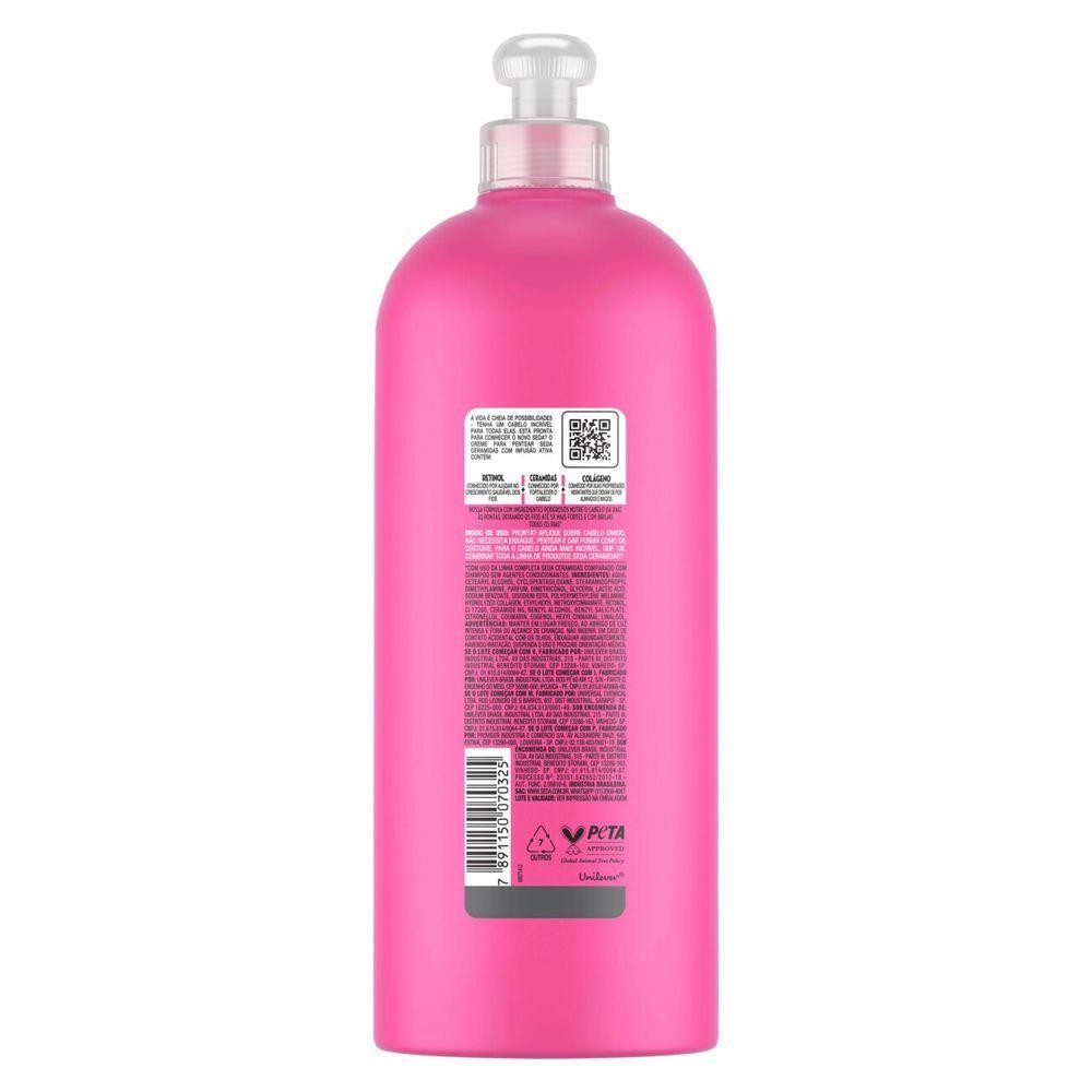 • O Creme para Pentear Seda Ceramidas conta com Infusão Ativa, que possui uma poderosa combinação de vitamina, óleo e proteína, desenvolvida para as necessidades do seu cabelo • A fórmula contém retinol, conhecido por ajudar no crescimento saudável dos fios, ceramidas, conhecido por fortalecer o cabelo, e colágeno, com ação hidratante que deixa os fios alinhados e macios • Esse creme para pentear com ceramidas e colágeno é indicado para cabelos sem danos a levemente danificados. Pode ser usado diariamente • A fórmula do Creme para Pentear Seda Ceramidas conta com ingredientes poderosos garantindo nutrição capilar da raiz às pontas • O creme ceramidas deixa os fios até 5x mais fortes e com brilho e hidratação todos os dias* • O Creme de Pentear Ceramidas Seda foi desenvolvido para deixar seu cabelo do jeito que você gosta. Mais forte e brilhante para arrasar! A vida é cheia de possibilidades - tenha um cabelo incrível para todas elas. Está pronta para conhecer o novo Seda? O Creme para Pentear Seda Ceramidas com Infusão Ativa tem uma poderosa combinação de vitamina, óleo e proteína, desenvolvido para as necessidades do seu cabelo. A fórmula contém Retinol, conhecido por ajudar no crescimento saudável dos fios, Ceramidas, conhecida por fortalecer o cabelo, e Colágeno conhecido por suas propriedades hidratantes que deixam os fios alinhados e macios. Nossa fórmula com ingredientes poderosos garantindo nutrição capilar da raiz às pontas, deixando os fios até 5x mais fortes e com brilho e hidratação todos os dias*. O Creme para Pentear Seda Ceramidas é indicado para cabelos normais a levemente danificados, podendo ser usado diariamente. Pronta? Aplique sobre o cabelo úmido. Não necessita enxágue. Pentear e dar forma como de costume. Para o cabelo ainda mais incrível, que tal combinar com o uso do Shampoo Seda Ceramidas e do Tratamento Condicionador Seda Ceramidas? A garrafa do Creme para pentear Seda Ceramidas é feita com plástico 100% reciclável. Seda também possui a certificação PETA, o que garante que ele não é testado em animais. *com uso da linha completa Seda Ceramidas comparado com shampoo sem agentes condicionantes.