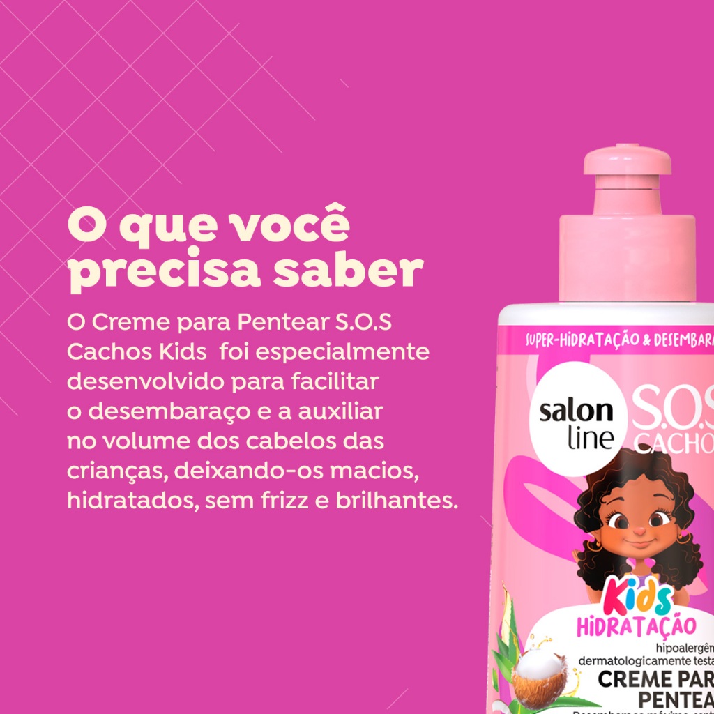 Hidratação, controle de frizz e volume controlado O que você precisa saber? O Creme para Pentear S.O.S Cachos Kids> foi especialmente desenvolvido para facilitar o desembaraço e a auxiliar no volume dos cabelos das crianças, deixando-os macios, hidratados, sem frizz e brilhantes. INDICAÇÕES Para quais tipos de cabelo? Cabelos ondulados, cabelos cacheados e cabelos crespos. Qual a indicação? Cabelos ressecados, cabelos danificados e cabelos volumosos. Pode usar a partir de quantos anos? A partir de 03 anos. ATIVOS Quais os principais ativos? Óleo de coco: proporciona cabelo macio e nutrição aos fios, pois é rico em vitaminas do complexo B, C e ácidos graxos. Aloe vera: possui propriedades hidratantes e emolientes, deixando os fios selados e macios, proporcionando controle de frizz e cabelo brilhos MODO DE USO Qual a melhor forma de usar? Com os cabelos limpos e úmidos, aplique o Creme para Pentear Salon Line mecha a mecha, uniformemente, do comprimento às pontas, desembaraçando com um pente de dentes largos. Em seguida, amasse os cachos, iniciando o movimento das pontas até a raiz. Repita este movimento quantas vezes achar necessário para os cachos se formarem. A quantidade a ser aplicada dependerá do comprimento e volume dos fios. Não enxágue. Uso diário. Dicas de uso Para melhores resultados, utilize a o shampoo, o condicionador, a máscara hidratante e o ativador de cachos da linha S.O.S Cachos Kids da Salon Line. CARACTERÍSTICAS É produto vegano? O Creme para Pentear S.O.S Cachos Kids é vegano. É liberado? O Creme para Pentear S.O.S Cachos Kids não é liberado.