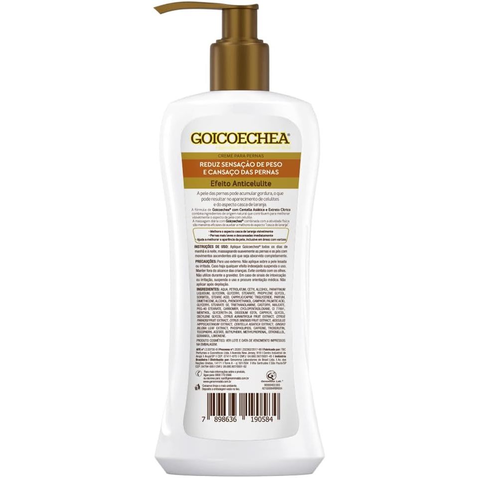 Creme para Pernas Goicoechea Anticelulite 350g O Creme Goicoechea Anticelulite é um tratamento cosmético diário desenvolvido para melhorar o aspecto da pele das pernas, ajudando a suavizar visivelmente os sinais da celulite. Com fórmula exclusiva enriquecida com extratos botânicos e ingredientes firmadores, ele proporciona hidratação profunda, tonificação e uma pele mais uniforme e revitalizada. Principais Características: Fórmula Anticelulite com Cafeína e Centella Asiática Atua diretamente nas áreas com celulite, ajudando a estimular a circulação e reduzir o aspecto de “casca de laranja”. Hidratação Profunda e Prolongada Proporciona hidratação intensa desde a primeira aplicação, melhorando a elasticidade e o toque da pele. Textura Leve e de Rápida Absorção Não deixa a pele oleosa e permite vestir-se logo após a aplicação. Benefícios: Reduz a aparência da celulite com uso contínuo Tonifica e firma a pele das pernas Estimula a microcirculação local Melhora a textura e uniformidade da pele Sensação imediata de frescor e leveza Hidratação prolongada Diferenciais do Produto: Combinação de ingredientes reconhecidos no combate à celulite: Cafeína + Centella Asiática Dermatologicamente testado Desenvolvido especialmente para as pernas Embalagem econômica de 350g com excelente rendimento Indicado para todos os tipos de pele Especificações Técnicas: Peso: 350g Instruções de Uso: Aplicar diariamente, preferencialmente após o banho, sobre a pele limpa e seca. Massagear com movimentos circulares e ascendentes, especialmente nas áreas com maior concentração de celulite (coxas, glúteos, pernas). Para melhores resultados, utilizar de forma contínua. Avisos e Precauções: Uso externo. Não aplicar sobre a pele irritada ou lesionada. Evitar contato com os olhos. Em caso de contato, enxaguar abundantemente com água. Mantenha fora do alcance de crianças. Conservar em local fresco, seco e ao abrigo da luz. Em caso de sinais de irritação, suspenda o uso e procure orientação médica. O que está incluso? 1 unidade de Creme para Pernas Goicoechea Anticelulite 350g ---- DÚVIDAS FREQUENTES ---- Os produtos são originais? Sim. Todos os nossos produtos são originais. Emitem nota fiscal? Sim. Emitimos nota fiscal para todos os pedidos.
