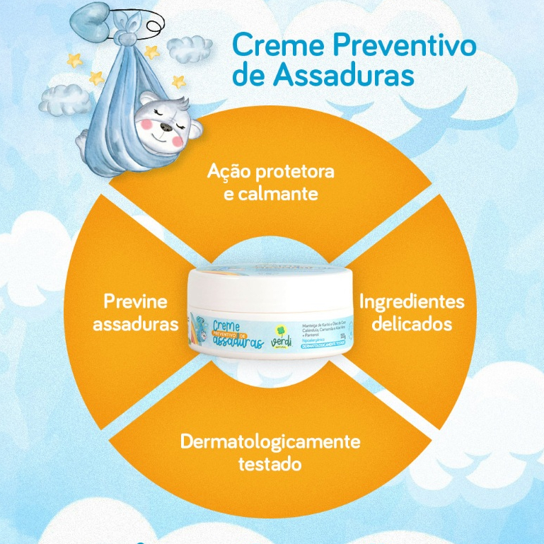 SEJA BEM-VINDO(A) A LOJA BABY GIRASSOL STORE🧸💛🌻 ✨ Proteja e mime a pele do seu bebê com o nosso Creme Preventivo de Assaduras da Verdi Natural! Sua fórmula 100% natural e segura oferece uma proteção eficaz contra assaduras, enquanto acalma e hidrata delicadamente a pele do seu pequeno. 💚 Indicado para as trocas diárias de fraldas, transformando cada momento em um gesto de carinho e proteção. Cuide da pele delicada do seu bebê com amor e suavidade. 💖👶 👉 Feito com manteiga de Karité, óleo de coco, Calêndula, Camomila, Aloe Vera + Pantenol, age protegendo e hidratando quem você mais ama. 🥰 O Creme Preventivo de Assaduras da Verdi Natural protege seu bebê de forma 100% natural e segura. Sua fórmula tem ação protetora, calmante e anti-inflamatória e não possui ingredientes nocivos à saúde. É indicado para as trocas diárias de fralda, previne contra as assaduras e também hidrata as regiões ressecadas no corpinho do bebê, auxiliando no tratamento de assaduras já instaladas. Ingredientes de derivação natural, conservantes delicados e aprovados pelas certificadoras (COSMOS), transformando cada troca de fraldas em um momento de carinho e proteção. Cuidado para a pele delicada do seu bebê. Principais Benefícios: 🍀Ingredientes Naturais: Composição cuidadosamente selecionada de ingredientes naturais como Manteiga de Karité, Óleo de Coco, Calêndula, Camomila, Aloe Vera e Pantenol. 🍀Hipoalergênico e Dermatologicamente Testado: Seguro para a pele sensível do bebê, o creme é hipoalergênico e passou por rigorosos testes dermatológicos. 🍀Proteção Eficaz: Formulado para proteger e nutrir, ajuda a prevenir assaduras, proporcionando conforto e bem-estar ao seu bebê. 🍀Sem Ingredientes Nocivos: Livre de corantes, fragrâncias artificiais, óleo mineral, parafina e silicone, nossa fórmula prioriza ingredientes vegetais e naturais para uma experiência de cuidado seguro e eficaz. ✅ Volume: Bisnaga (85g) / Pote (150g) ✅ Principais Ativos: Manteiga de Karité, Óleo de Coco, Calêndula, Camomila, Aloe Vera + Pantenol ✅ Aprovado na Anvisa: Processo número 25351.798682/2023-21 ✅ Indicações de uso: - uso diário na região de fraldas, dobrinhas do bumbum e virilha. - com ingredientes naturais; - dermatologicamente testado; - ph balanceado; - fórmula suave; - fácil aplicação; - sem parabenos, sulfatos e corantes; - cruellty free; - reciclável; - vegano; - eureciclo; - formulado por mulheres. IMPORTANTE: - Por gentileza antes de efetuar sua compra leia todo o anúncio; - Mantenha seus dados cadastrais atualizados; - Devido as diferentes configurações de monitores ou luz, pode haver variações nos tom das cores. Em caso de dúvidas, entre em contato conosco pelo chat de atendimento ao cliente que iremos lhe retornar o mais breve possível. Estamos á disposição para melhor atendê-lo! 👩🏻💻🛒