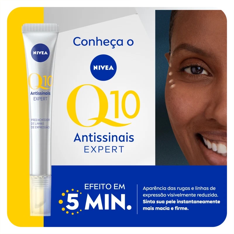 Creme Preenchedor De Rugas Q10 Antissinais Nivea 15ml É um preenchedor de linhas de expressão com efeito em 5 minutos, Desenvolvido para proporcionar melhora instantânea das rugas e redução delas com o uso contínuo. Benefícios: - Ação comprovada para suas rugas - Efeito em 5 minutos - Com Q10 puro e Peptídeos de Bioxifil - Aplicação localizada - 5% de complexo ativo - Melhora instantaneamente as rugas - Preenchedor de linhas de expressão - Reduz rugas com uso contínuo - Rápida absorção - Dermatologicamente e oftalmologicamente testado Modo de uso: Passo 1: Aplique nas linhas e rugas na testa, ao redor dos olhos e dobras nasolabiais com o aplicador fácil de usar. Passo 2: Espalhe uniformemente com a ponta dos dedos. Dica: Também pode ser aplicado em todo o rosto para hidratar e suavizar intensamente a pele.