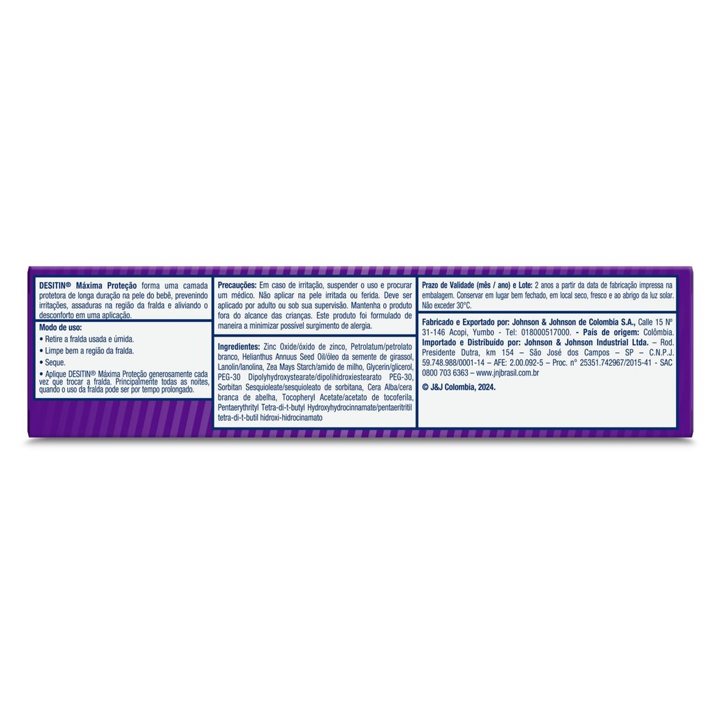 DESITIN® Máxima Proteção forma uma barreira protetora de longa duração na pele do bebê, prevenindo irritações, assaduras e tem efeito reparador em uma aplicação. 40% Óxido de Zinco: forma uma camada protetora e promove a regeneração da barreira da pele Óleo de Girassol: para uma hidratação intensa Vitamina E: com ação antioxidante Hipoalergênico Fórmula testada por pediatras e dermatologistas Eficácia clinicamente comprovada