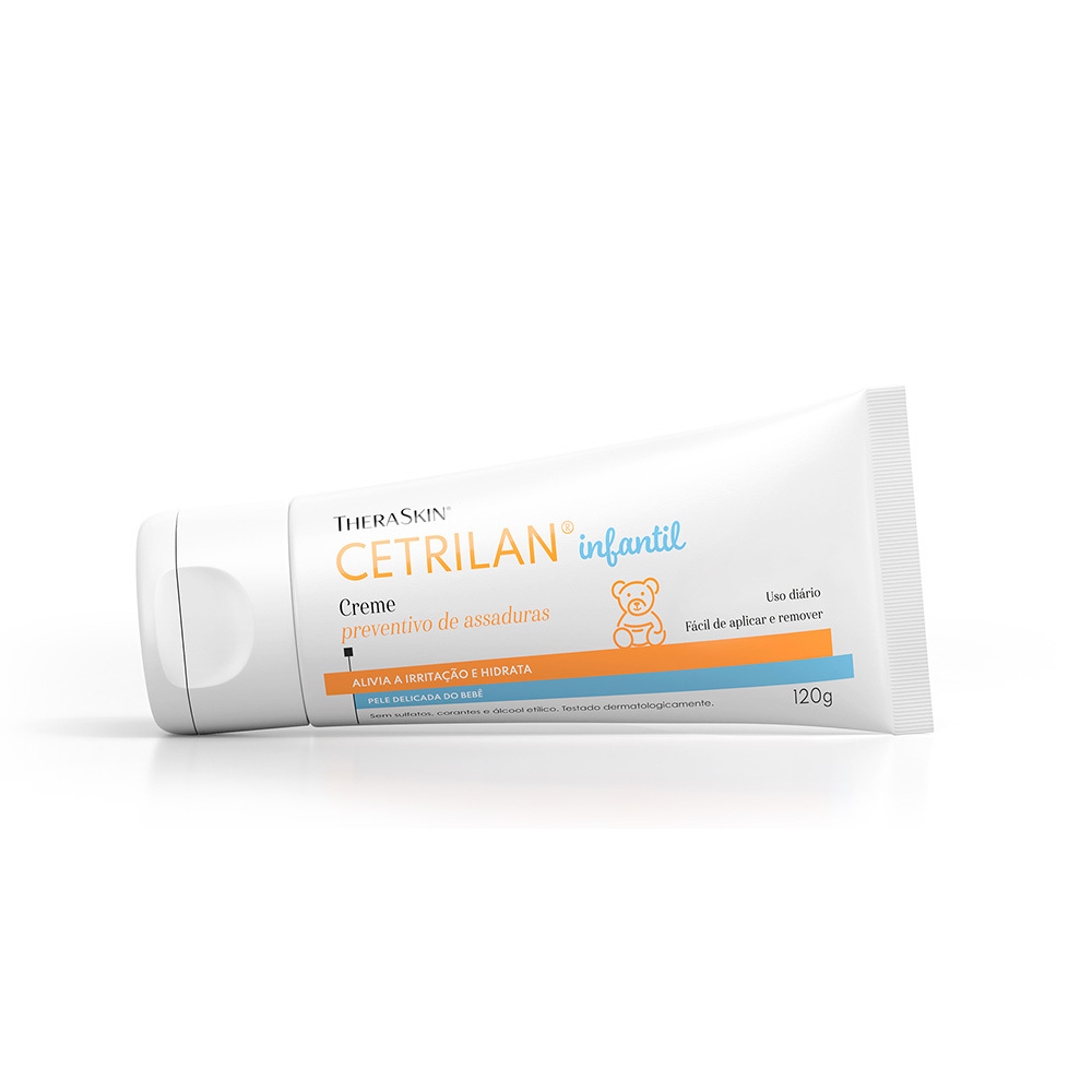 Cetrilan 120g Creme Protetor De Assaduras TheraSkin O Creme Protetor de Assaduras Cetrilan 120g é indicado para a proteção da pele do bebe contra assaduras. Sua formulação com óleo de calêndula reúne ingredientes com ação anti-inflamatória, que melhora a textura da pele, protege e acalma peles irritadas. Sua composição conta também com óleos de amêndoas doce e lanolina que proporciona ação lubrificante, facilitando ainda a remoção na troca de fraldas. Na formulação única e completa de Cetrilan Creme, está presente o Óxido de Zinco que diminui o contato da pele do bebê com as fezes e urina, com ação absorvente, protetora e secante, minimizando a fricção. COMO USAR: Aplicar de 1 a 2 vezes ao dia. Na prevenção de assaduras, utilizar Cetrilan Creme a cada troca de fraldas.