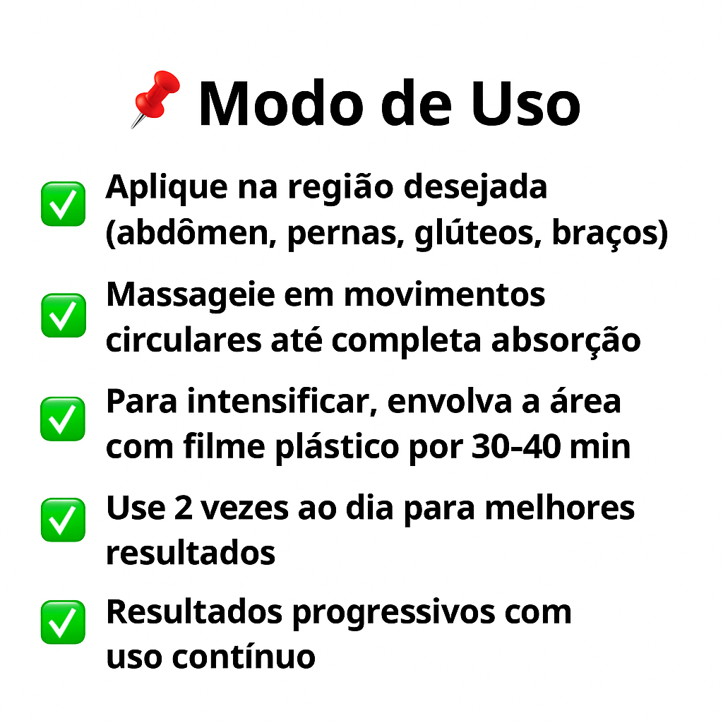 Creme Redutor de Medidas Pimenta Negra 200g – Ativador da Circulação, Firmador e Anticelulite | Rhenuks Cosméticos Reduza medidas, ativa a circulação e conquiste uma pele mais firme com o poder da Pimenta Negra! O Creme Redutor de Medidas Pimenta Negra é um potente estimulante natural que melhora a circulação sanguínea, promove a desintoxicação do corpo e auxilia na tonificação e elasticidade da pele. Quando ativado, ele potencializa a sensação de calor, acelerando o metabolismo e favorecendo a redução de medidas e celulite. Dica Essencial: Para obter resultados ainda mais eficazes, combine o uso do creme com uma alimentação equilibrada e a prática regular de exercícios físicos. Principais Benefícios do Gel Pimenta Negra Poderoso remodelador corporal, ajudando a definir e tonificar a pele; Ação antioxidante, combatendo os radicais livres e prevenindo o envelhecimento precoce; Estimula a renovação celular, deixando a pele mais macia e saudável; Ativa a circulação dos tecidos, reduzindo inchaços e melhorando a firmeza da pele; Fórmula segura e eficaz, dermatologicamente testada e não agressiva para a pele. Modo de Uso: Aplique na pele limpa e seca, massageando com movimentos circulares até completa absorção. Para melhores resultados, utilize diariamente. Sinta o efeito termogênico e conquiste uma pele mais firme, lisa e uniforme! Modo de Uso Eficaz Aplique uma quantidade adequada do gel na região desejada (abdômen, glúteos, pernas, braços ou costas). Massageie em movimentos circulares até completa absorção, estimulando a circulação local. Para potencializar os resultados, pode-se envolver a área com filme plástico por 30 a 40 minutos, aumentando o efeito de aquecimento. Utilize 2 vezes ao dia (de manhã e à noite) para melhores resultados. Uso contínuo potencializa a redução de medidas e melhora o aspecto da pele. Dica importante: sempre faça um teste de sensibilidade antes do uso e evite aplicar em mucosas, rosto ou áreas com feridas. Aplique na região desejada (abdômen, pernas, glúteos, braços). Massageie em movimentos circulares até completa absorção. Para intensificar, envolva a área com filme plástico por 30–40 min. Use 2 vezes ao dia para melhores resultados. Resultados progressivos com uso contínuo.
