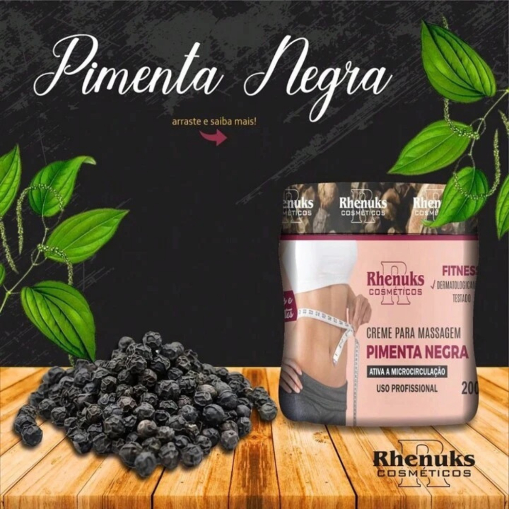 Creme Redutor de Medidas Pimenta Negra 200g – Ativador da Circulação, Firmador e Anticelulite | Rhenuks Cosméticos Reduza medidas, ativa a circulação e conquiste uma pele mais firme com o poder da Pimenta Negra! O Creme Redutor de Medidas Pimenta Negra é um potente estimulante natural que melhora a circulação sanguínea, promove a desintoxicação do corpo e auxilia na tonificação e elasticidade da pele. Quando ativado, ele potencializa a sensação de calor, acelerando o metabolismo e favorecendo a redução de medidas e celulite. Dica Essencial: Para obter resultados ainda mais eficazes, combine o uso do creme com uma alimentação equilibrada e a prática regular de exercícios físicos. Principais Benefícios do Gel Pimenta Negra Poderoso remodelador corporal, ajudando a definir e tonificar a pele; Ação antioxidante, combatendo os radicais livres e prevenindo o envelhecimento precoce; Estimula a renovação celular, deixando a pele mais macia e saudável; Ativa a circulação dos tecidos, reduzindo inchaços e melhorando a firmeza da pele; Fórmula segura e eficaz, dermatologicamente testada e não agressiva para a pele. Modo de Uso: Aplique na pele limpa e seca, massageando com movimentos circulares até completa absorção. Para melhores resultados, utilize diariamente. Sinta o efeito termogênico e conquiste uma pele mais firme, lisa e uniforme! Modo de Uso Eficaz Aplique uma quantidade adequada do gel na região desejada (abdômen, glúteos, pernas, braços ou costas). Massageie em movimentos circulares até completa absorção, estimulando a circulação local. Para potencializar os resultados, pode-se envolver a área com filme plástico por 30 a 40 minutos, aumentando o efeito de aquecimento. Utilize 2 vezes ao dia (de manhã e à noite) para melhores resultados. Uso contínuo potencializa a redução de medidas e melhora o aspecto da pele. Dica importante: sempre faça um teste de sensibilidade antes do uso e evite aplicar em mucosas, rosto ou áreas com feridas. Aplique na região desejada (abdômen, pernas, glúteos, braços). Massageie em movimentos circulares até completa absorção. Para intensificar, envolva a área com filme plástico por 30–40 min. Use 2 vezes ao dia para melhores resultados. Resultados progressivos com uso contínuo.