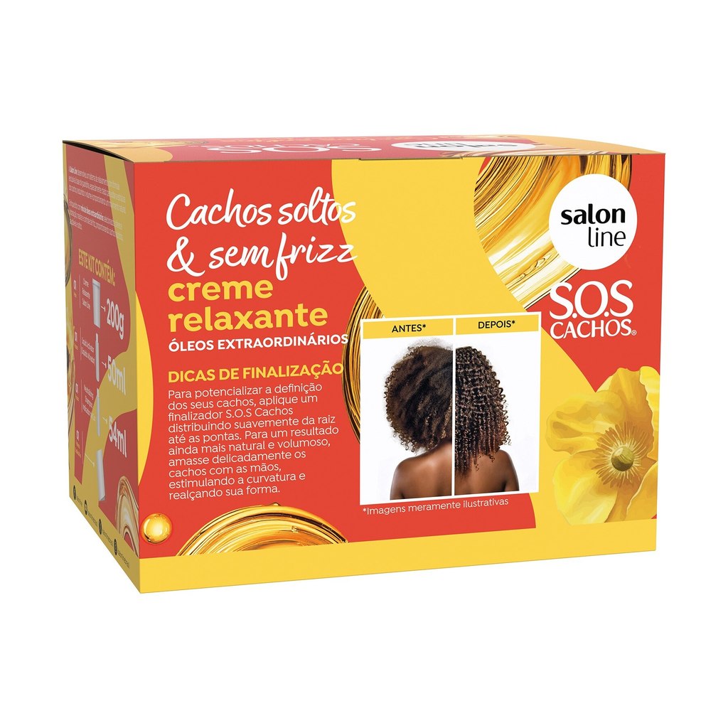O Creme Relaxante S.O.S Cachos Cachos Soltos & Sem Frizz solta a curvatura, controla o volume e entrega definição intensa. Indicado para cabelos cacheados e crespos, deixa os fios alinhados, nutridos e com muito mais movimento. <>INDICAÇÕES$& Para quais tipos de cabelo? Para cabelos crespos e cacheados. Qual a indicação? Para cabelos encolhidos e com frizz. Pode usar a partir de quantos anos? A partir de 12 anos. <>ATIVOS$& Quais os principais ativos? Todos os cremes relaxantes são à base de guanidina com potencializadores de tratamento Mix de Óleos Extraordinários: revitalizam os fios potencializando a nutrição e a hidratação capilar. <>MODO DE USO$& Qual a melhor forma de usar? Todos os kits acompanham creme relaxante, líquido ativador, shampoo neutralizante e folheto explicativo, garantindo um processo seguro e uniforme. Leia e siga corretamente as instruções contidas no folheto explicativo. Teste de mecha: importante para verificar o tempo de ação ideal e as condições dos fios para o relaxamento. Preparação: Antes de iniciar, divida o cabelo em 4 partes. Aplique Keratin Hair Food Salon Line no pescoço, orelhas, contorno do rosto, linha do cabelo e couro cabeludo. Em caso de retoque, aplique também no comprimento. Coloque as luvas. Preparo da mistura: Não utilize materiais metálicos. Use somente utensílios plásticos (pente e espátula). Aplicação: Comece pela parte de trás, mecha a mecha, aplicando generosamente com um pincel. Cubra todo o cabelo rapidamente para assegurar cobertura uniforme. Utilize a palma das mãos para suavizar a aplicação, sempre no sentido dos fios. Em cabelos virgens, enluve gentilmente com 0,5 cm de distância da raiz. Não puxe ou estique os fios. Nos minutos finais, massageie para garantir uma distribuição homogênea. Enxágue e neutralização Enxágue iniciando pela parte de trás, com água morna ou em temperatura ambiente. Aplique o Neutralizing Shampoo Salon Line, indispensável para a remoção total dos resíduos. Condicionamento e finalização Aplique um condicionador Salon Line, distribua, deixe agir por 5 minutos, enxágue e finalize como desejar. Dicas de uso: Use luvas durante todo o processo. Não lave os cabelos por pelo menos 3 dias antes do procedimento. Salon Line recomenda: Em caso de dúvidas, consulte um profissional ou entre em contato com o SAC. Os Cremes Relaxantes são compatíveis com Guanidina, Hidróxido de Sódio e Lithium, e incompatível com Tioglicolato de Amônia. Não é compatível com cabelos coloridos e descoloridos. <>CARACTERÍSTICAS$& É produto vegano? O Creme Relaxante S.O.S Cachos Cachos Soltos & Sem Frizz não é vegano. É liberado? O Creme Relaxante S.O.S Cachos Cachos Soltos & Sem Frizz não é liberado.