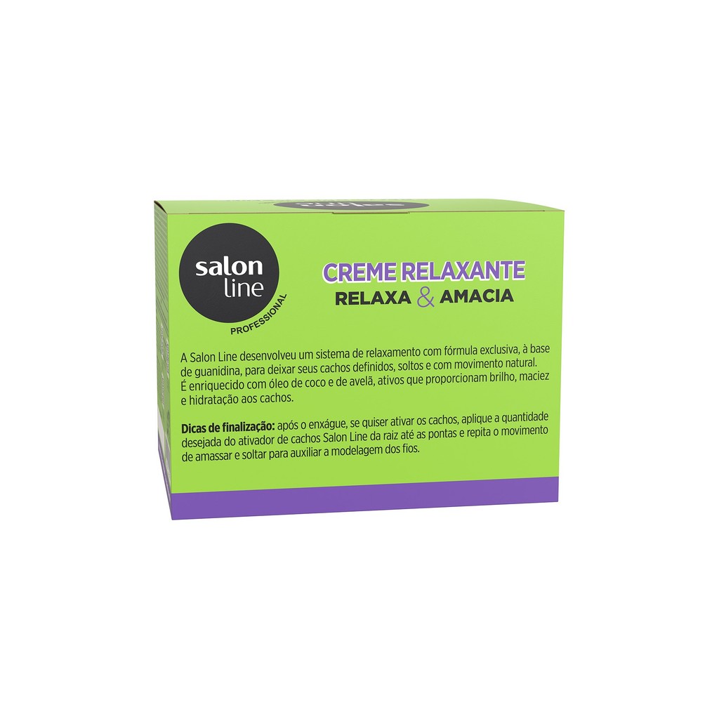 O Creme Relaxante Salon Line Óleo de Coco e Óleo de Avelã Cachos Definidos e Soltos foi especialmente desenvolvido para promover a soltura dos cachos. Sua fórmula à base de Guanidina, proporciona o relaxamento de cabelos crespos até atingirem o ponto de cacheados. Uso profissional. INDICAÇÕES Para quais tipos de cabelo? Cabelos cacheados e crespos. Qual a indicação? Cabelos volumosos e com frizz. Pode usar a partir de quantos anos? A partir de 12 anos. ATIVOS Quais os principais ativos? A fórmula do Creme de Relaxamento Cachos Definidos e Soltos conta com Óleo de Avelã para os cabelos, uma poderosa fonte de Vitamina A, E, do complexo B e Ácido Linoleico, que atua na nutrição capilar e antioxidação do fios. MODO DE USO Qual a melhor forma de usar? As instruções de uso completas estão contidas no folheto explicativo que acompanha o produto. A UTILIZAÇÃO INCORRETA PODE DANIFICAR O CABELO. Teste de mecha: é importante para verificar o tempo de ação ideal para o seu tipo de cabelo, bem como se os seus fios estão nas condições ideais para o relaxamento. Antes de iniciar o processo, divida o cabelo a partir do meio da cabeça em 4 partes - duas atrás e duas na frente. Aplique Keratin Hair Food Salon Line no pescoço, orelhas, em volta do rosto, na linha do cabelo e no couro cabeludo para evitar possíveis reações. Em caso de retoque, aplique também no comprimento do cabelo. Coloque luvas. Siga as etapas de aplicação a seguir e não pule nenhuma: 1. Preparo da mistura: não utilize materiais metálicos. Utilize sempre materiais em plástico (pente e espátulas) 2. Aplicação: comece o relaxamento pela parte de trás, mecha a mecha, aplicando generosamente com o auxílio de um pincel. Cubra todo o cabelo - e o mais rápido possível - para assegurar total cobertura de toda a cabeça. Após a aplicação do creme relaxante, utilize a palma da mão para suavizar as áreas de aplicação, sempre manipulando no sentido dos fios e nunca ao contrário, pois esse esforço poderá parti-los. Aplique o relaxamento por área. Em cabelos virgens, enluve gentilmente com 0,5 cm de distância da raiz às pontas. Não puxe ou estique o cabelo. Para obter distribuição homogênea, enluve e manuseie levemente os cabelos com as mãos e use os últimos minutos do tempo de relaxamento para massagear o cabelo, verificando se alguma área ficou sem aplicação. 3. Enxágue e neutralização: comece o enxágue pela parte de trás do cabelo, cuidadosamente, com água em abundância morna ou em temperatura ambiente. Aplique o Neutralizing Shampoo Salon Line. Ele é indispensável para a remoção total de resíduos. 4. Condicionamento e finalização: aplique um Condicionador Salon Line de sua preferência. Distribua uniformemente o produto por todo o cabelo e deixe agir por 5 minutos, enxágue e finalize como desejar. Lembre-se: o ideal é que se faça um tratamento diário com a linha Salon Line utilizando Shampoo, Máscara e Condicionador para que o cabelo fique ainda mais fortalecido. Dicas de uso Use luvas durante todo o processo de aplicação do creme de relaxamento/amaciamento e não lave os cabelos por pelo menos 3 dias antes do procedimento. Salon Line recomenda Em caso de dúvidas consulte um profissional ou ligue para o nosso SAC. CARACTERÍSTICAS É produto vegano? O produto não é vegano. É liberado? O produto não é liberado.